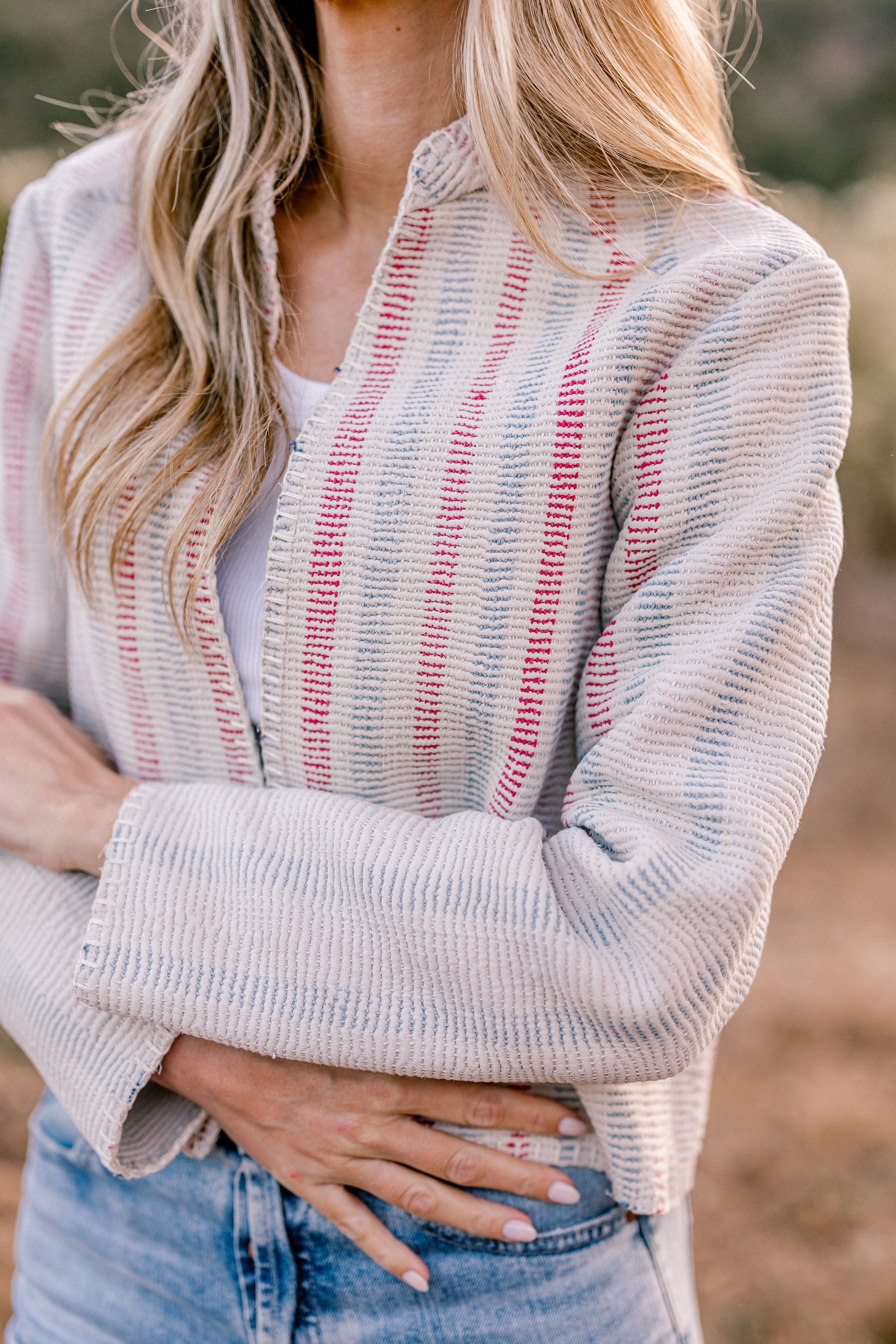 Embrace the beauty of tradition and contemporary style with our exquisite Kantha quilt jacket. Handcrafted by skilled artisans, this unique piece is a fusion of heritage and modern fashion. Each jacket is meticulously crafted using repurposed Vintage Kantha quilts, ensuring a one-of-a-kind garment that tells a story. Jackets are designed for a structured fit. Runs true to size.
