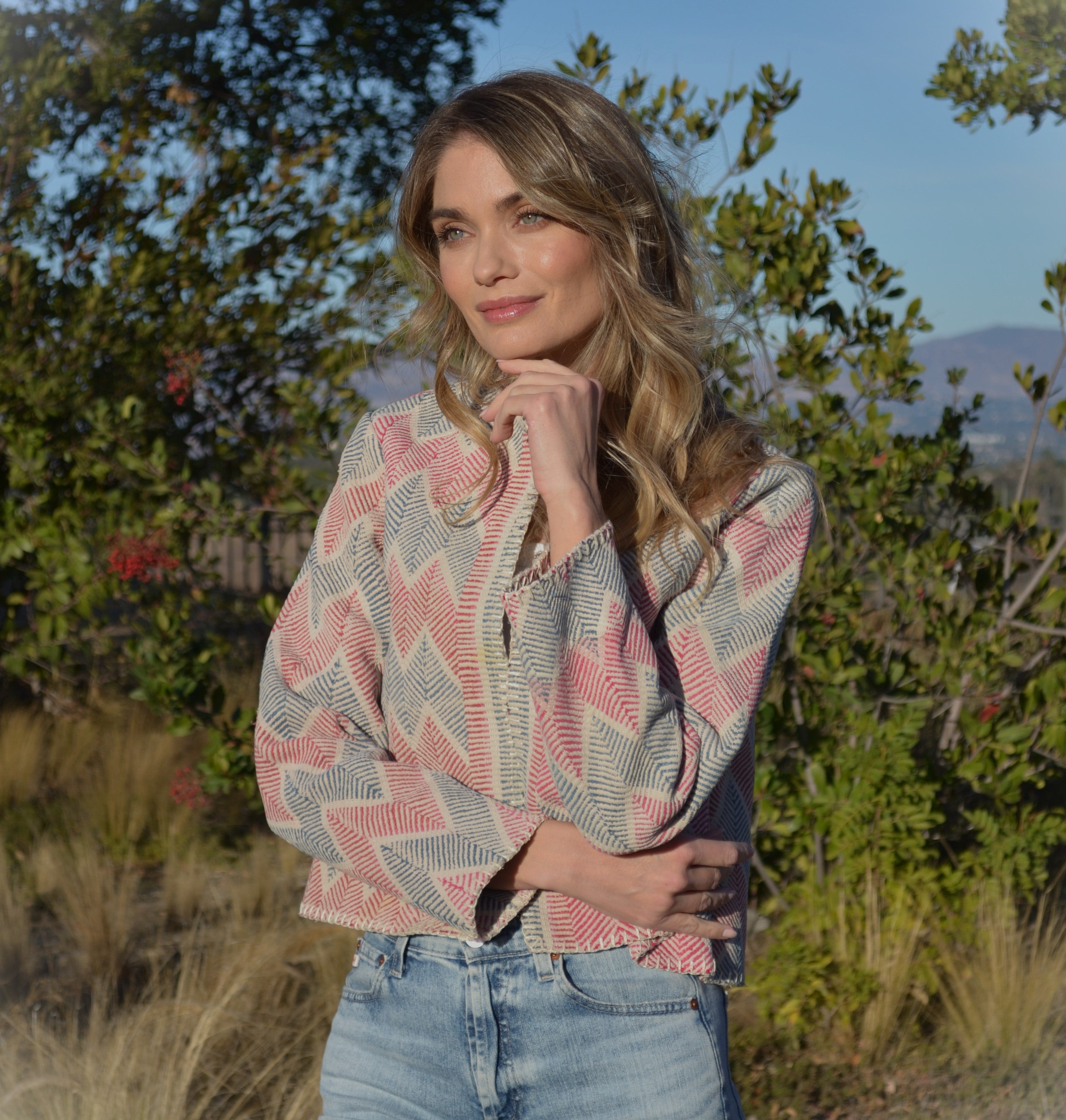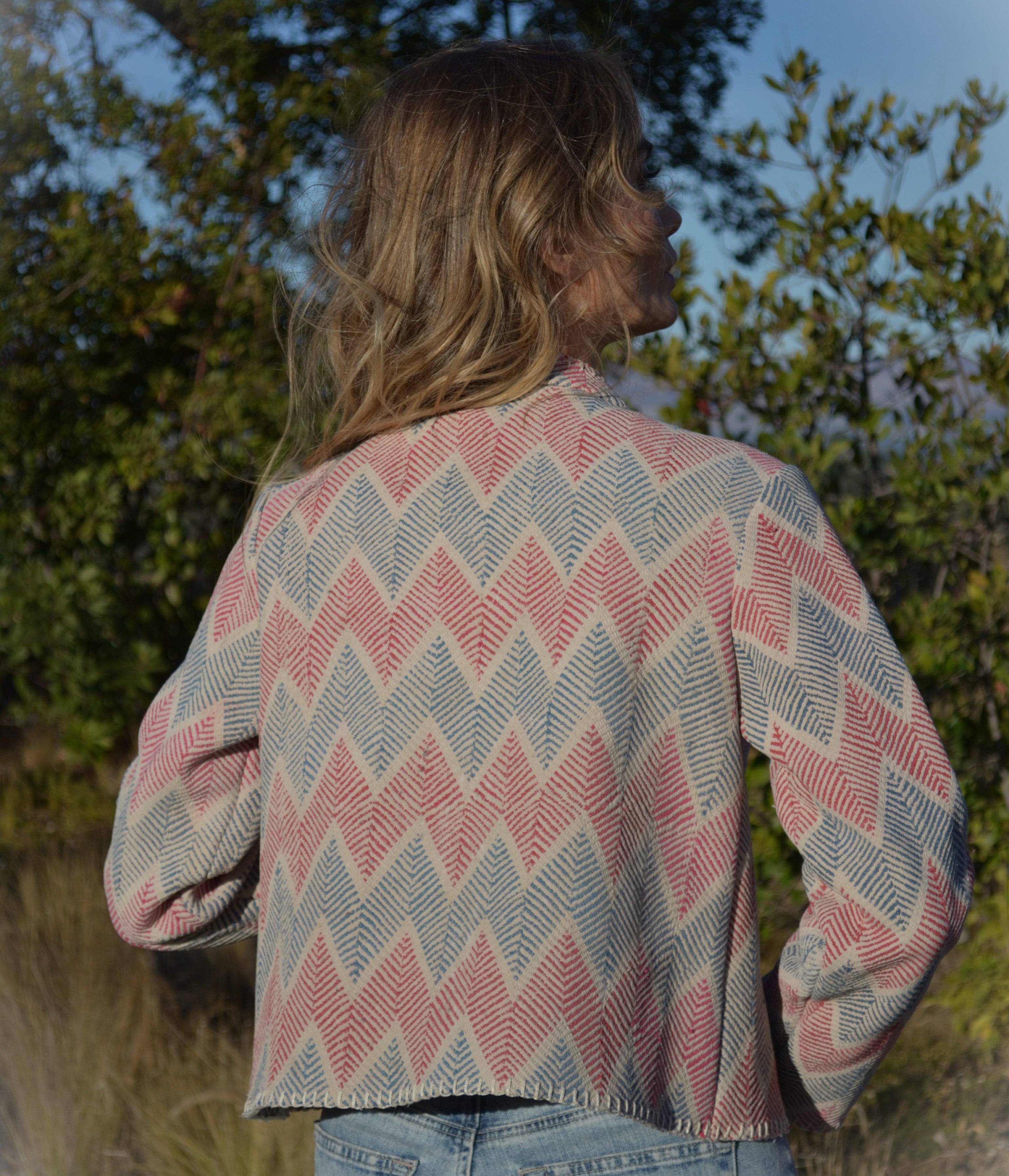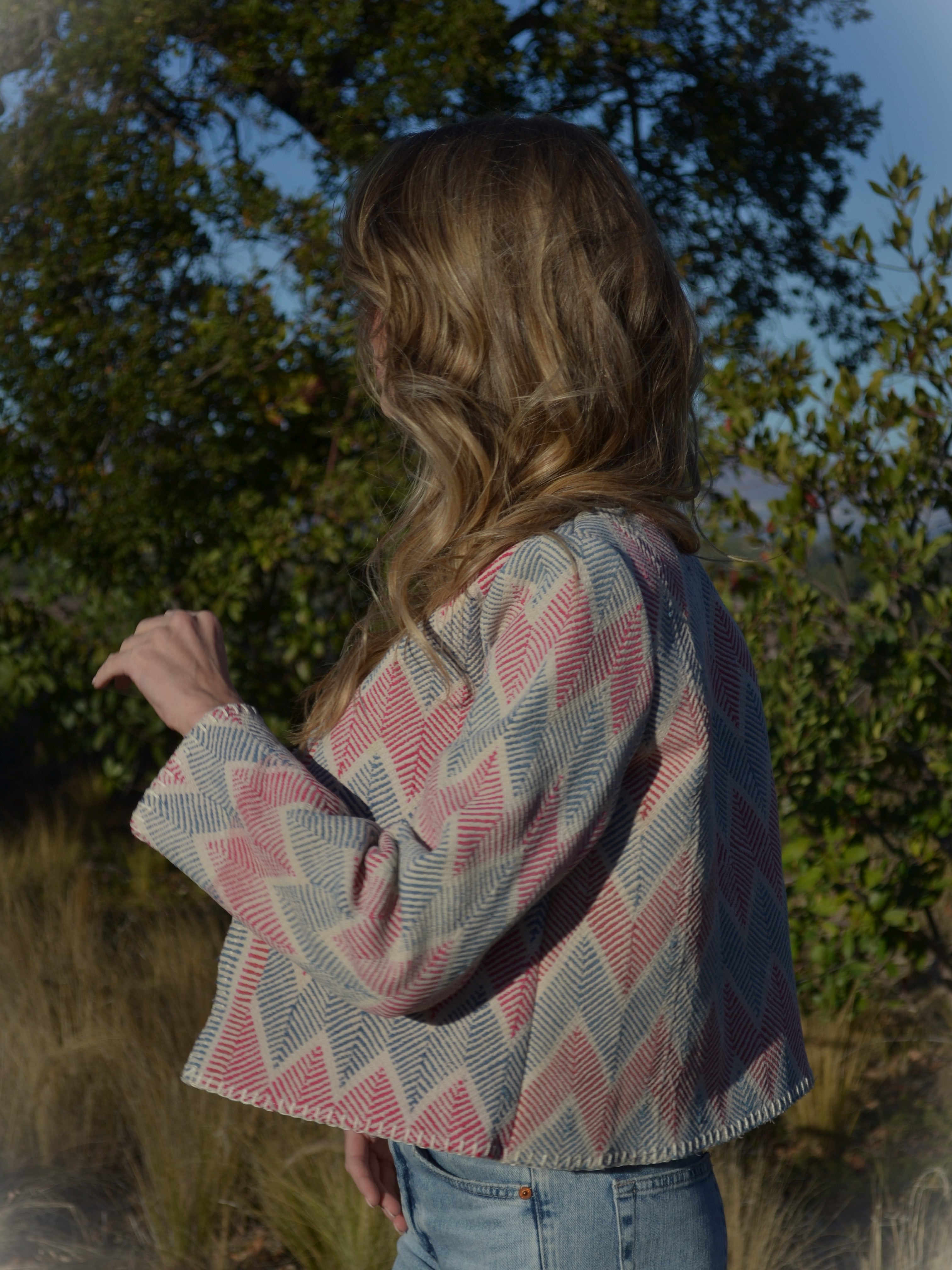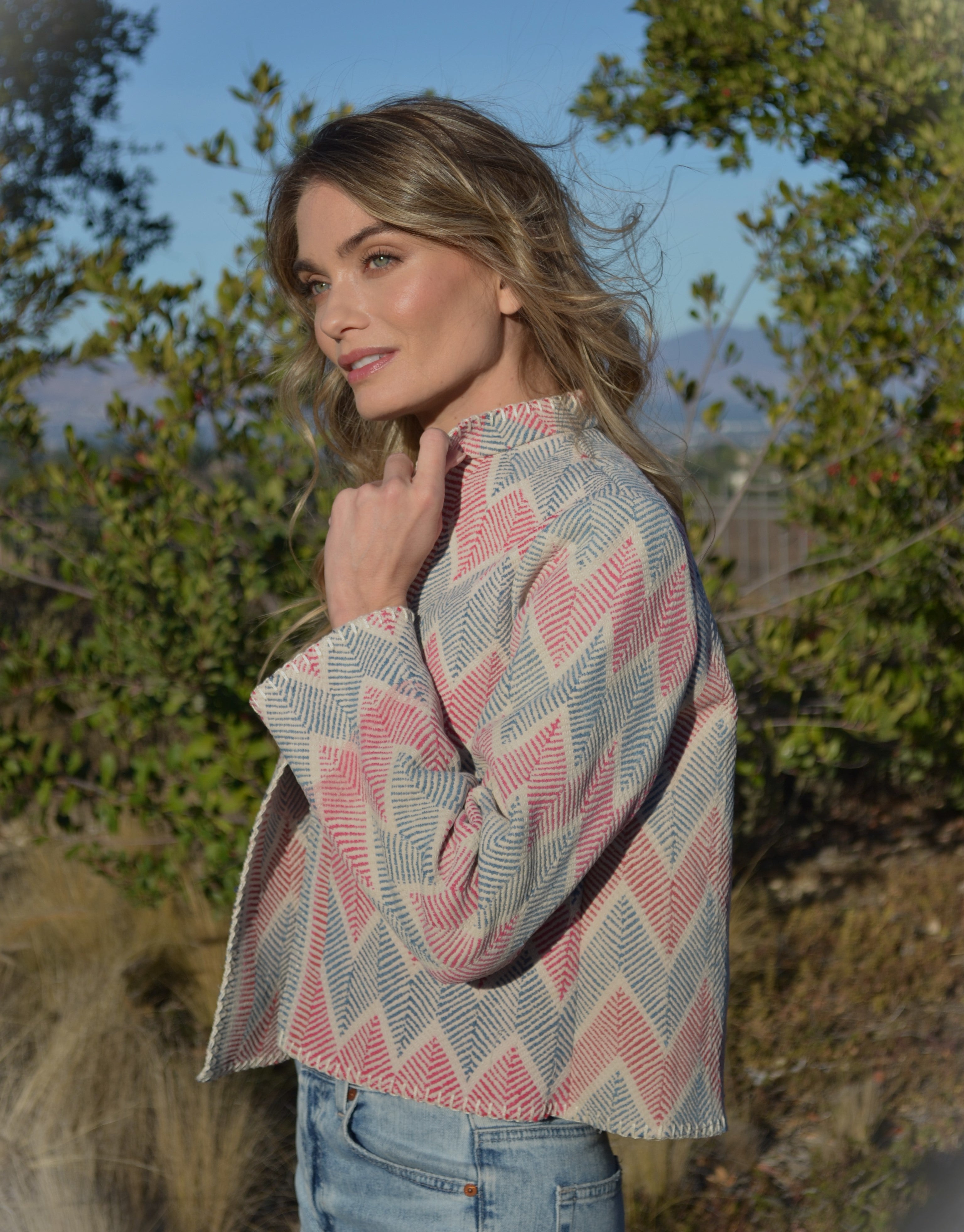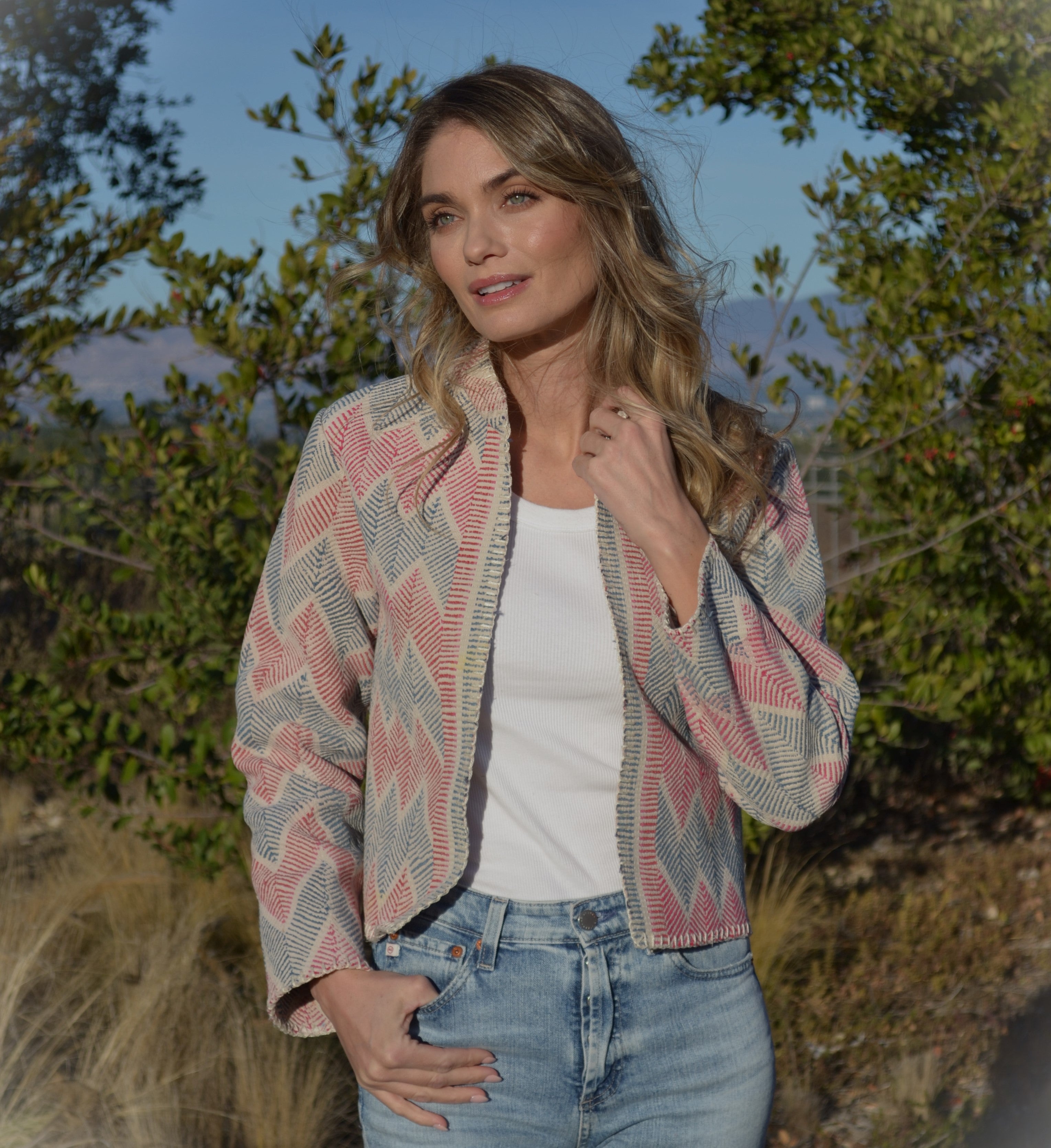 Ginxsi Jackets are made from repurposed Vintage Kantha quilts, and recycled cotton. The original patina may include areas of fraying or patches. Due to the nature of a handmade product, variations in the fabric and color make each piece unique.