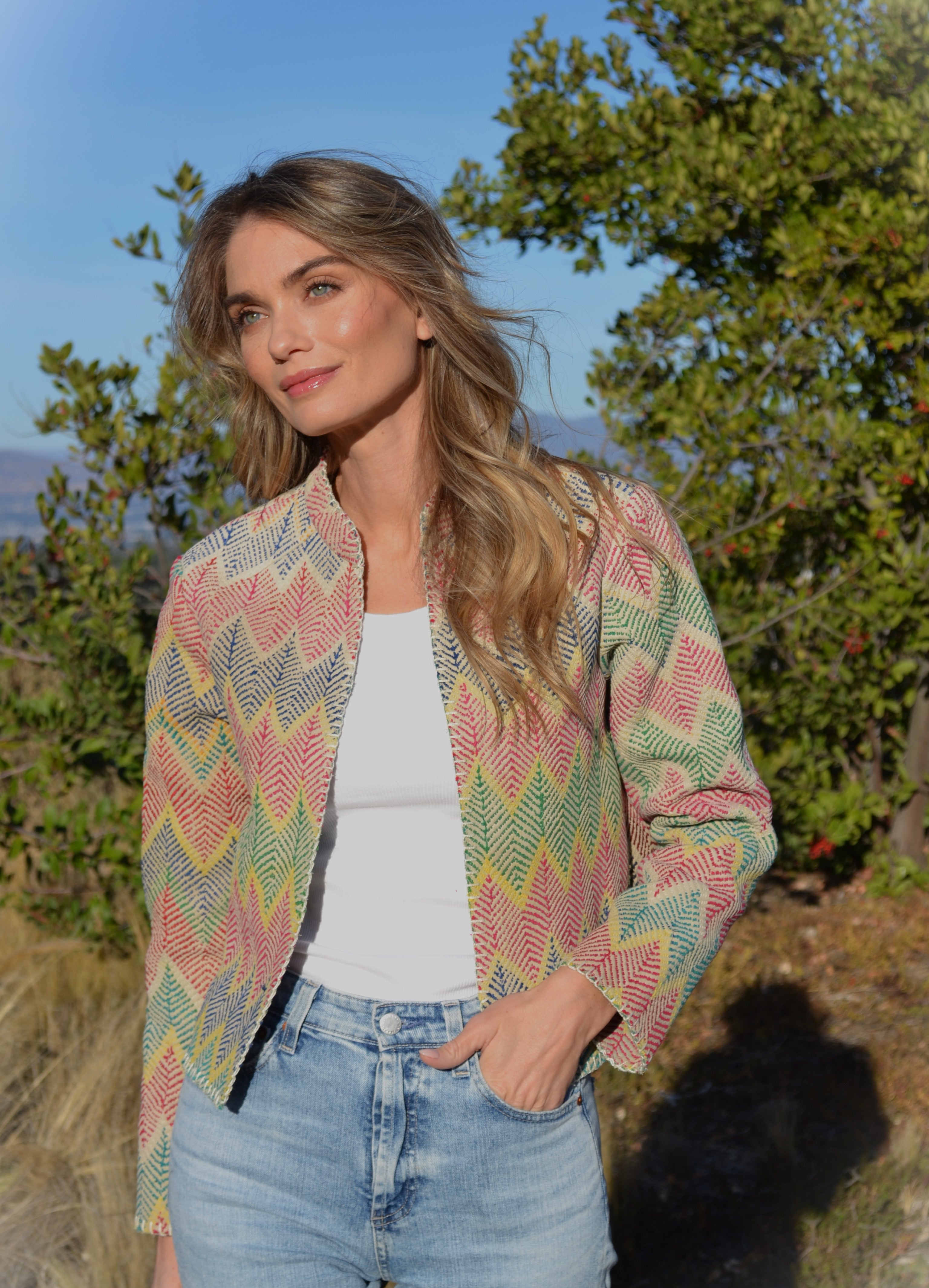 Embrace the beauty of tradition and contemporary style with our exquisite Kantha quilt jacket. Handcrafted by skilled artisans, this unique piece is a fusion of heritage and modern fashion. Each jacket is meticulously crafted using repurposed Vintage Kantha quilts, ensuring a one-of-a-kind garment that tells a story. Jackets are designed for a structured fit. Runs true to size.
