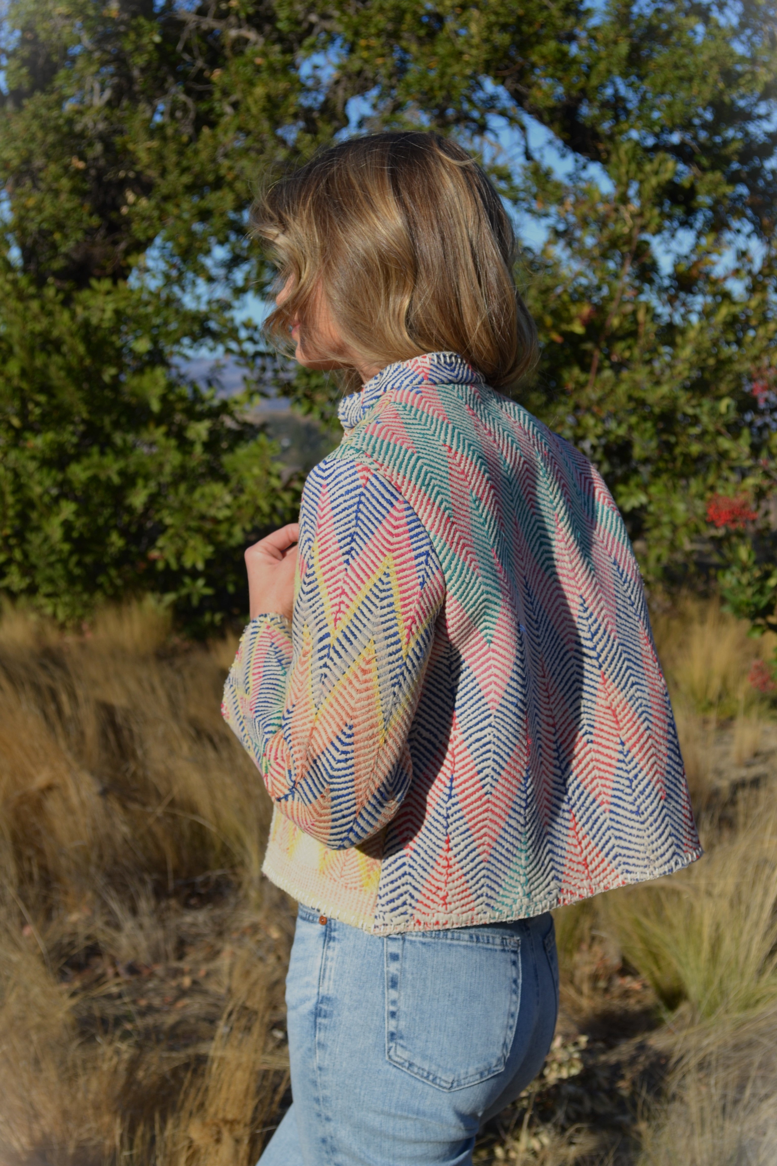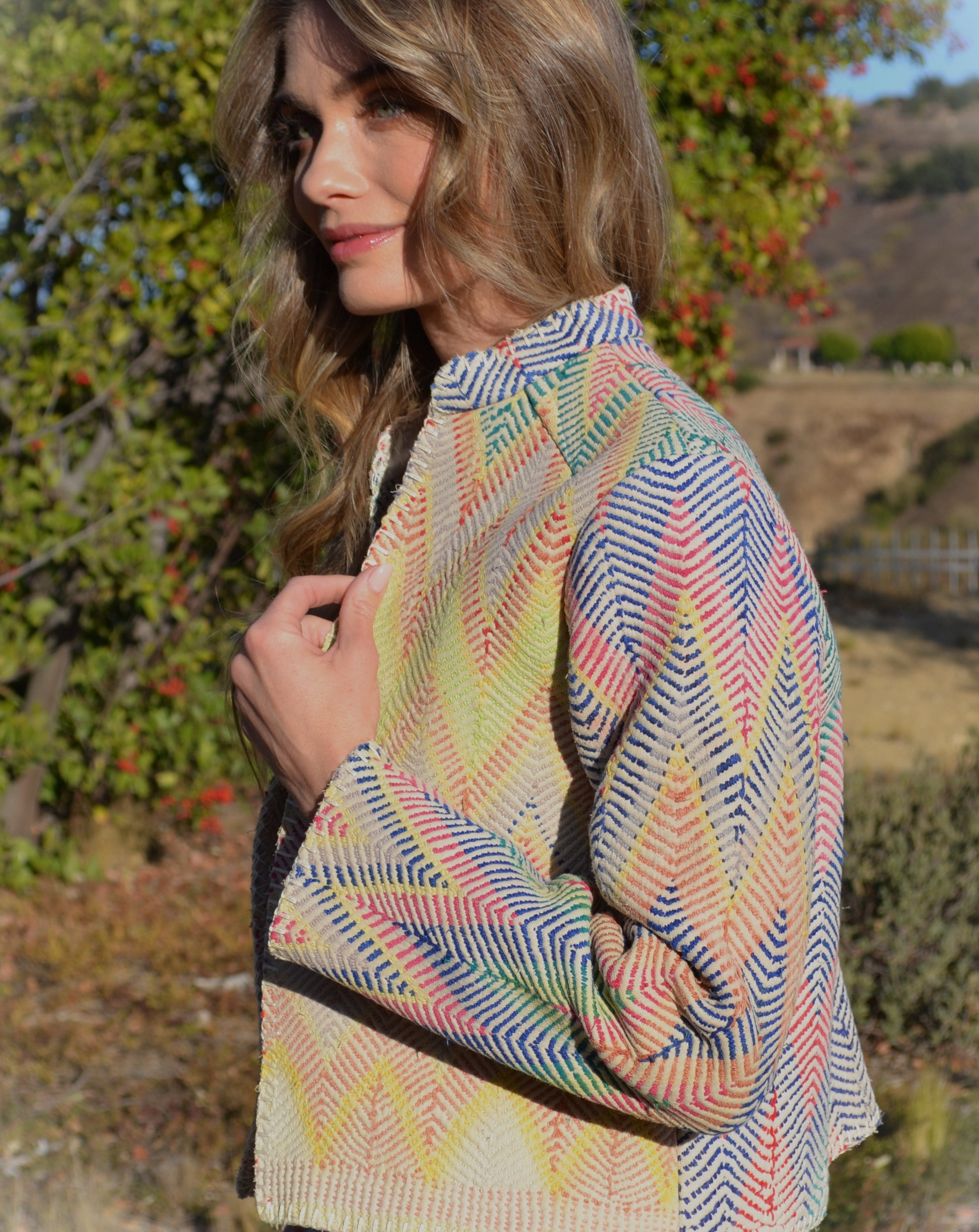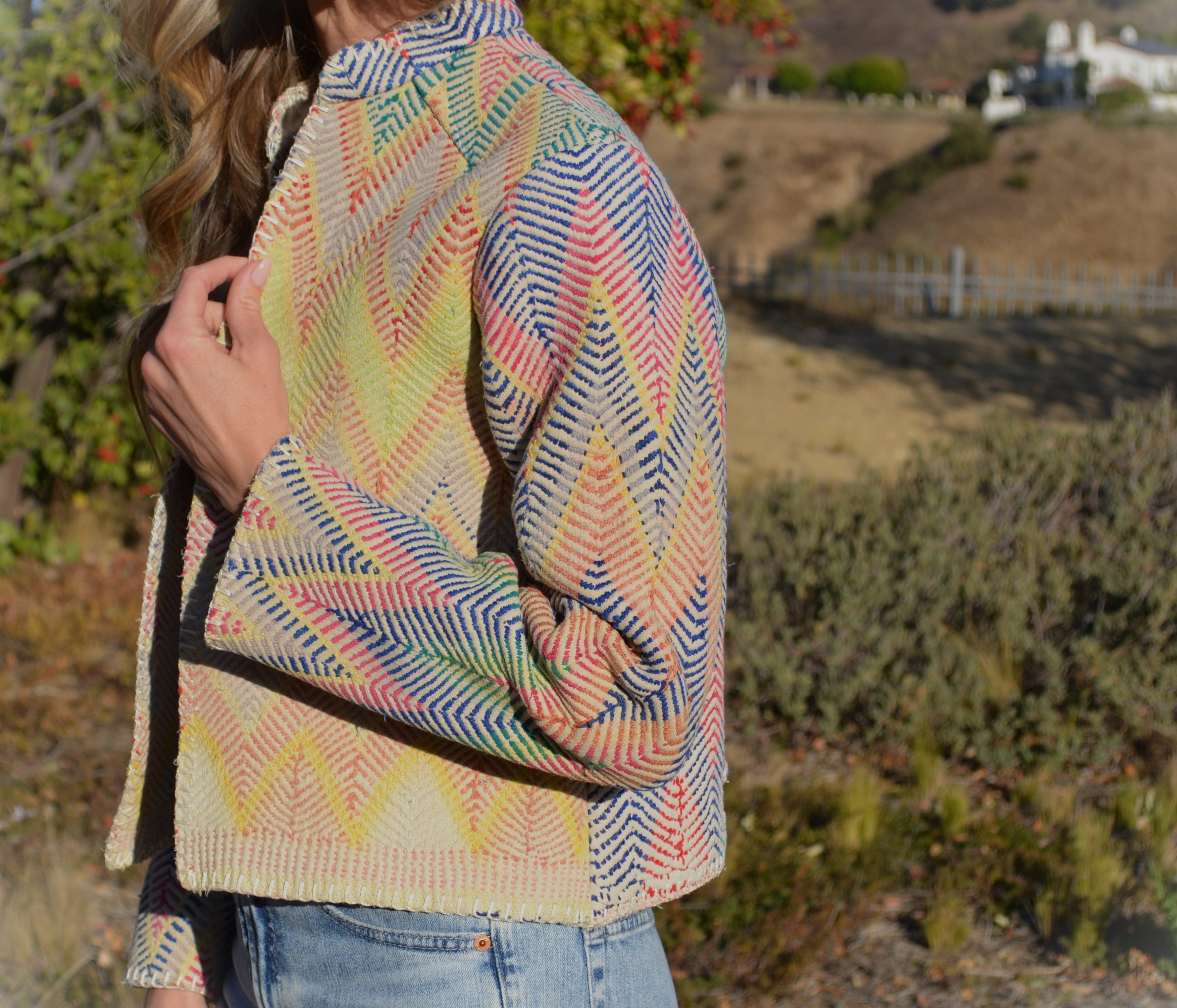 Ginxsi Jackets are made from repurposed Vintage Kantha quilts, and recycled cotton. The original patina may include areas of fraying or patches. Due to the nature of a handmade product, variations in the fabric and color make each piece unique.