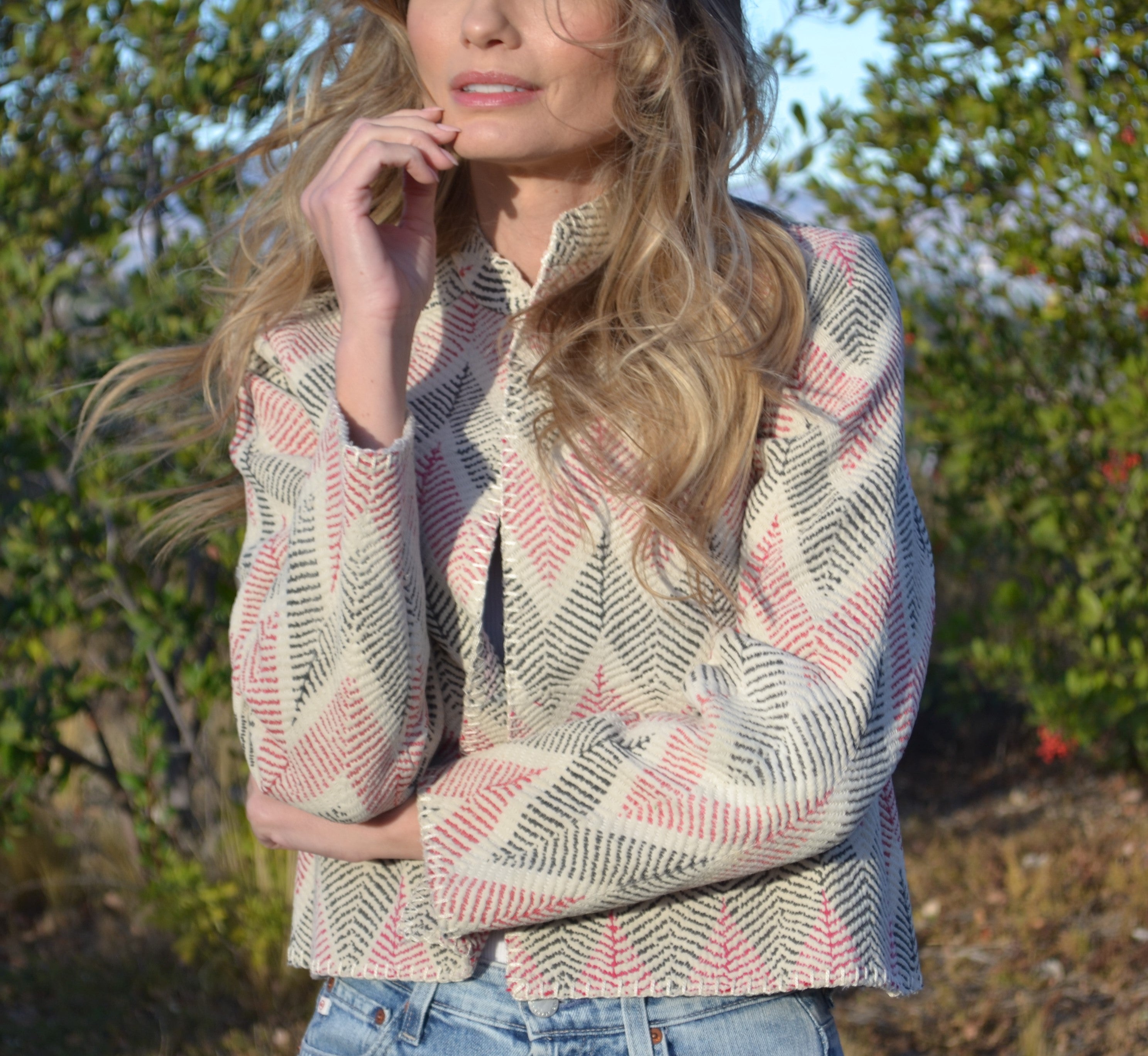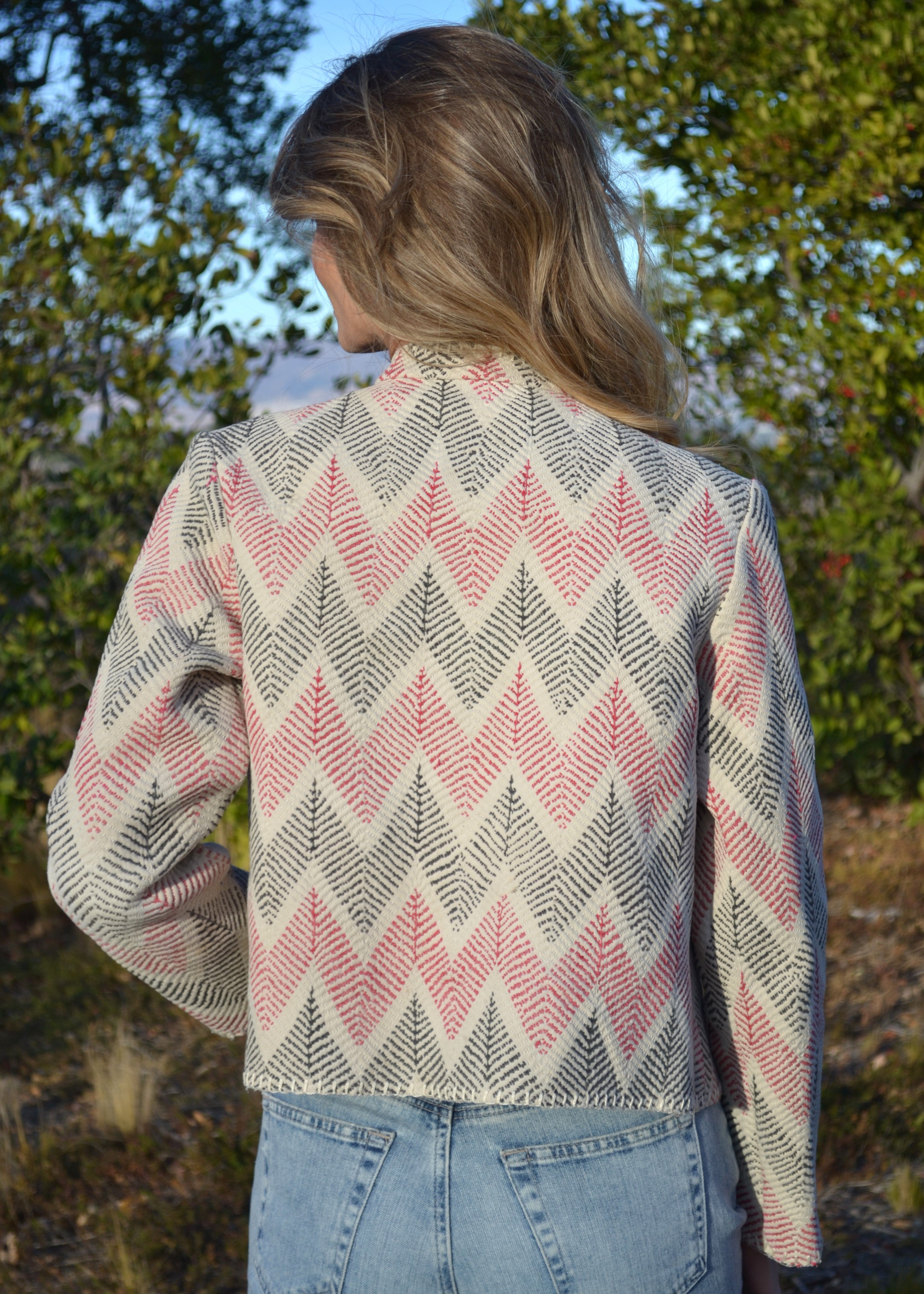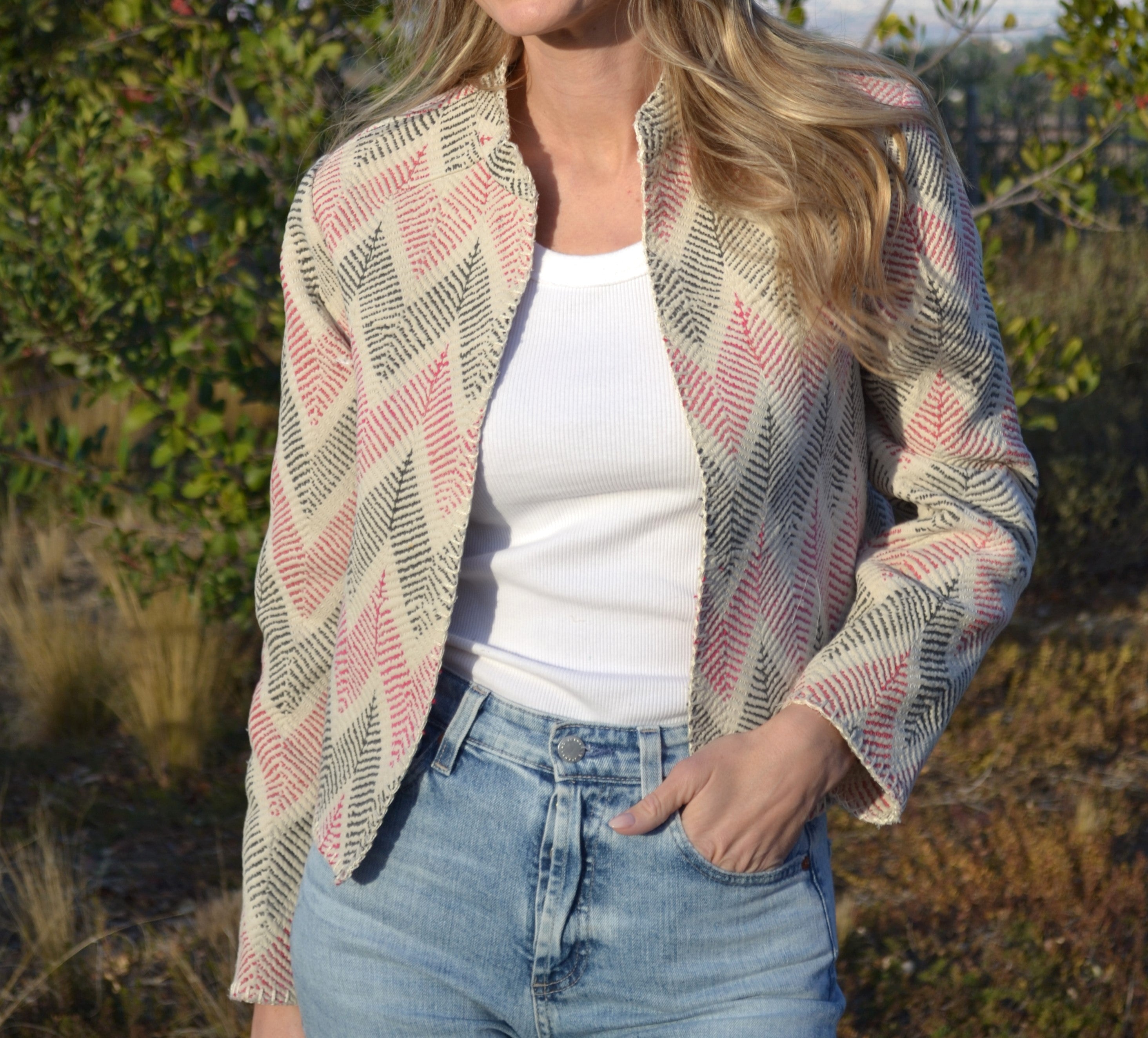 Ginxsi Jackets are made from repurposed Vintage Kantha quilts, and recycled cotton. The original patina may include areas of fraying or patches. Due to the nature of a handmade product, variations in the fabric and color make each piece unique.
