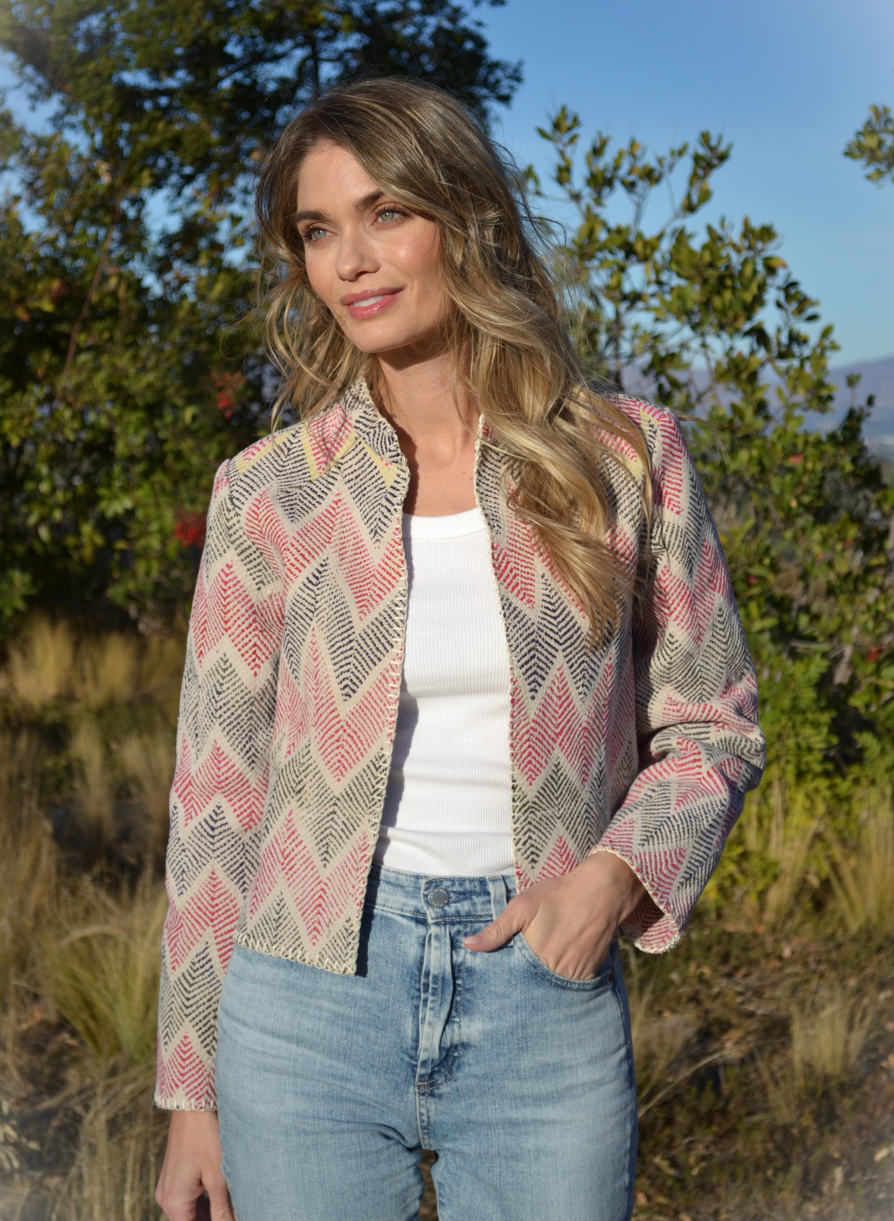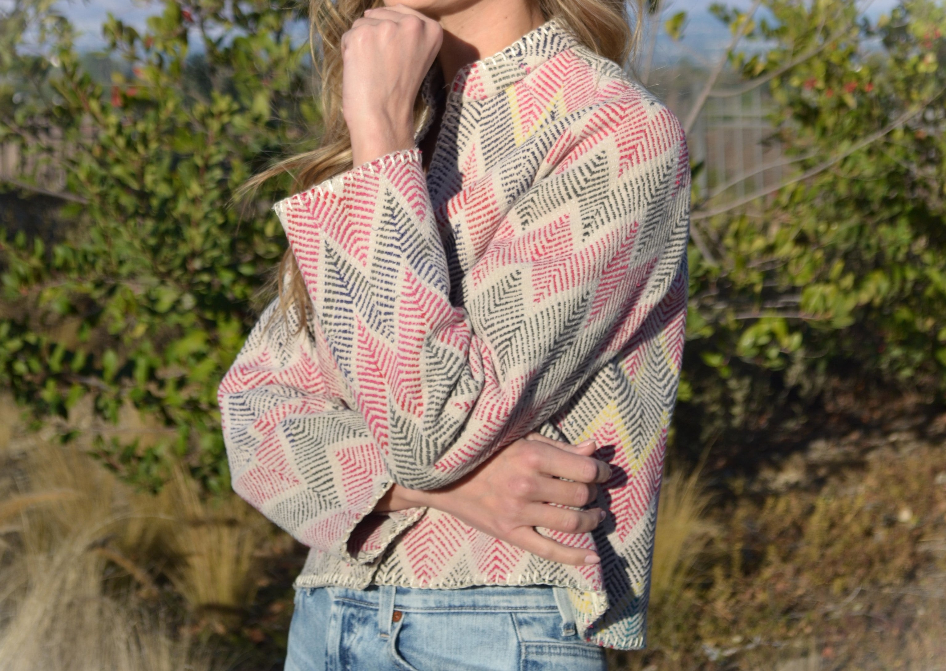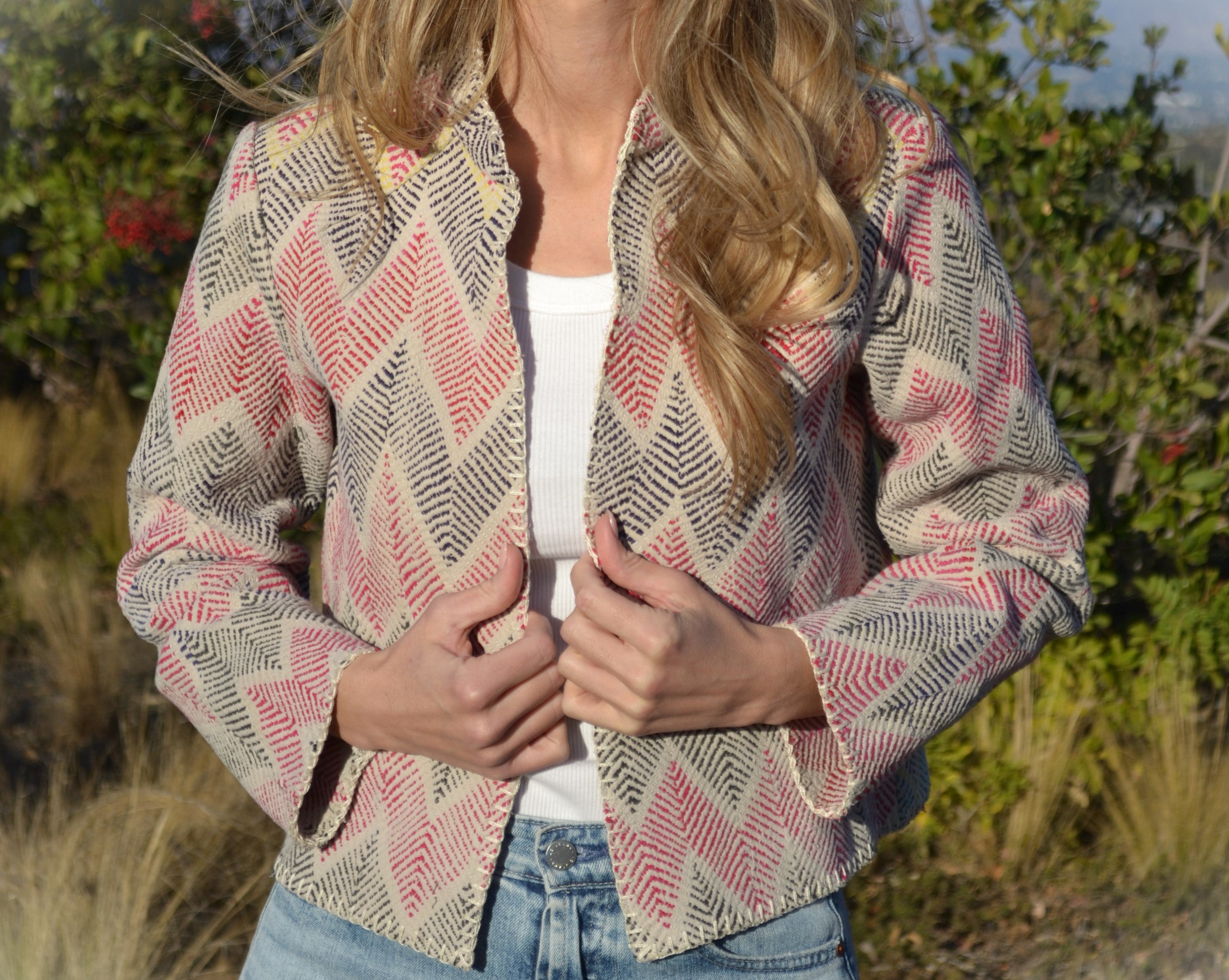 Ginxsi Jackets are made from repurposed Vintage Kantha quilts, and recycled cotton. The original patina may include areas of fraying or patches. Due to the nature of a handmade product, variations in the fabric and color make each piece unique.
