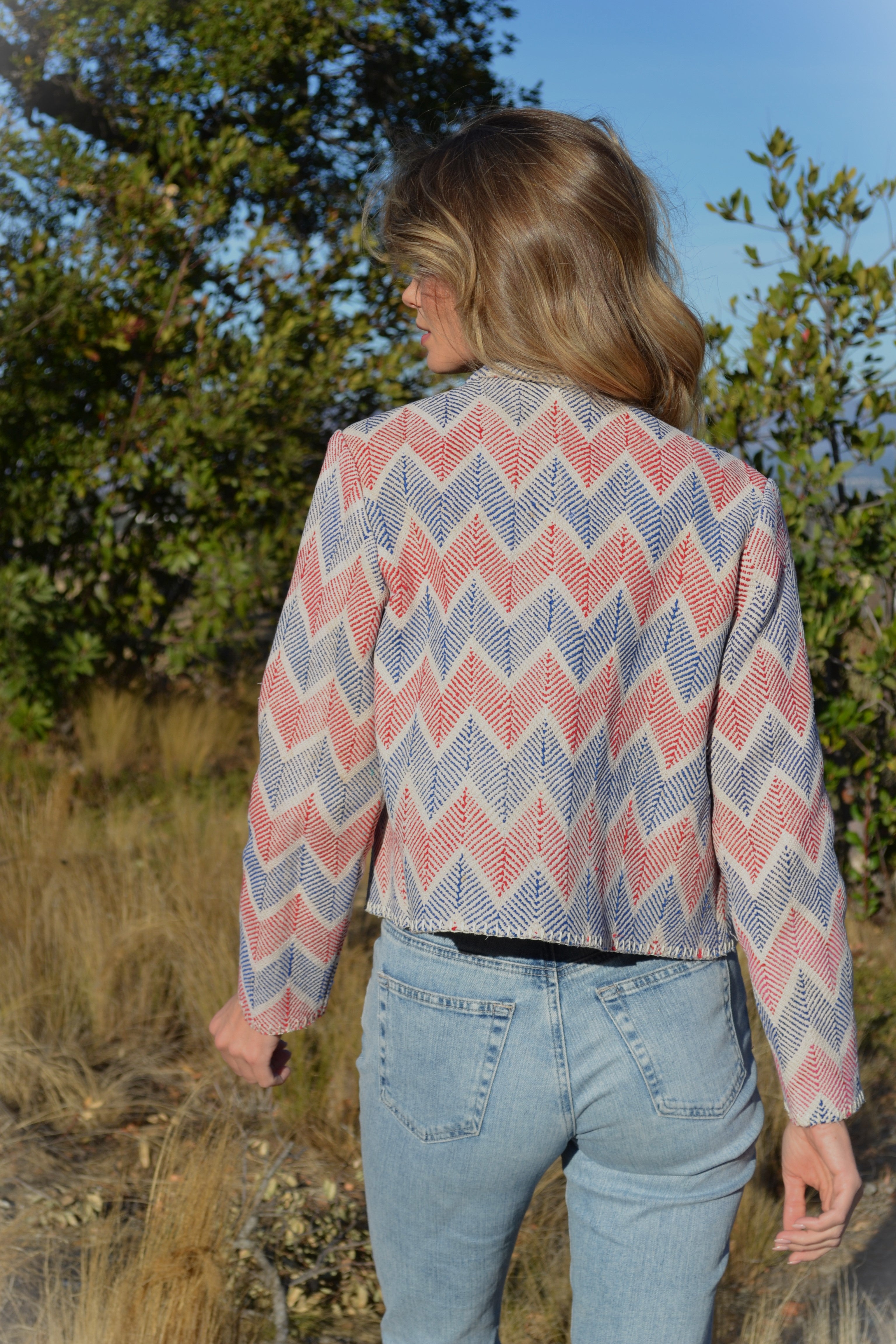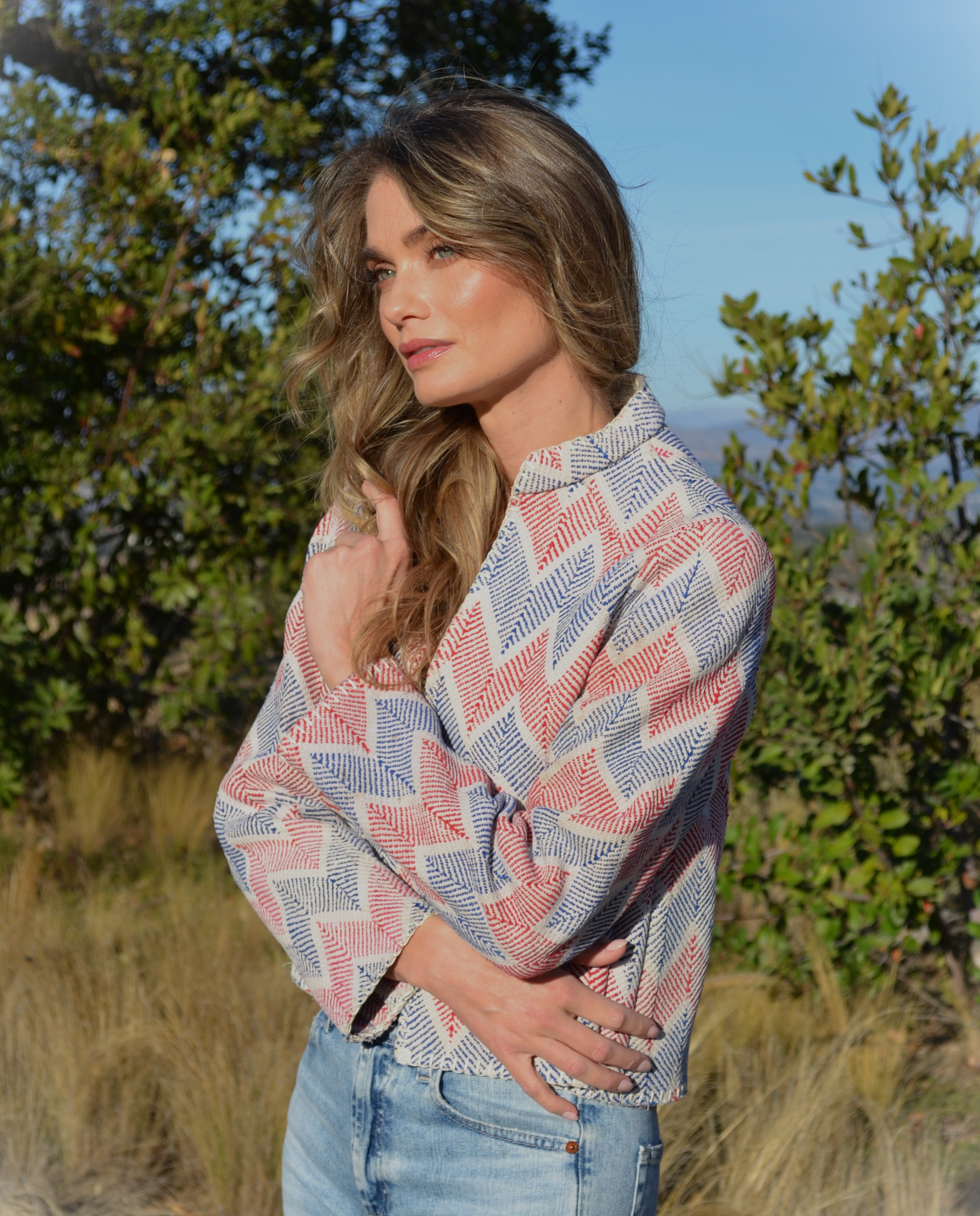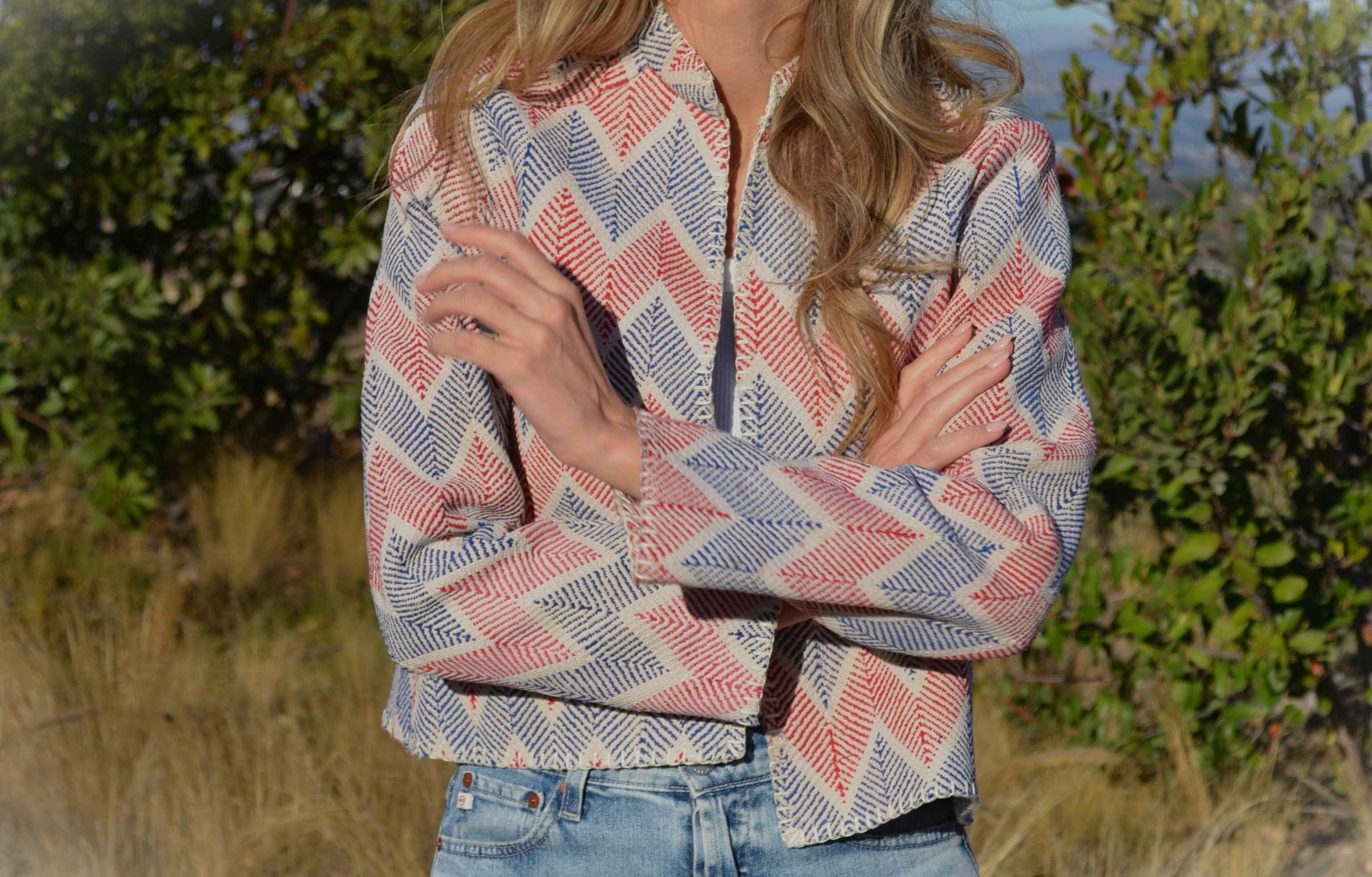 Ginxsi Jackets are made from repurposed Vintage Kantha quilts, and recycled cotton. The original patina may include areas of fraying or patches. Due to the nature of a handmade product, variations in the fabric and color make each piece unique.