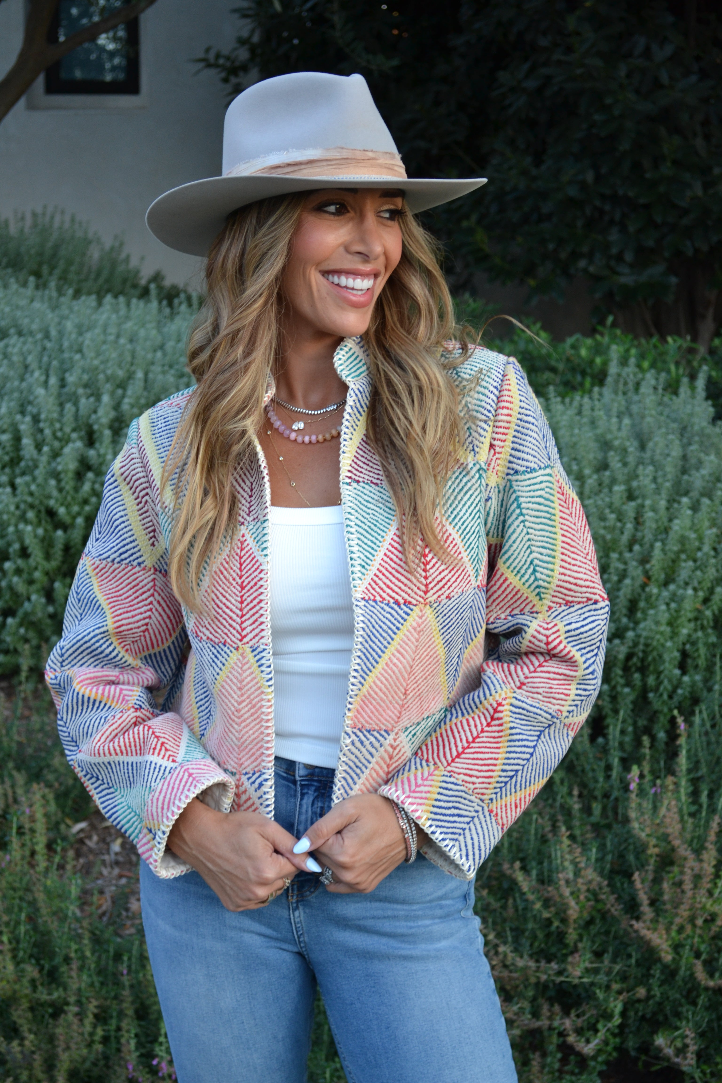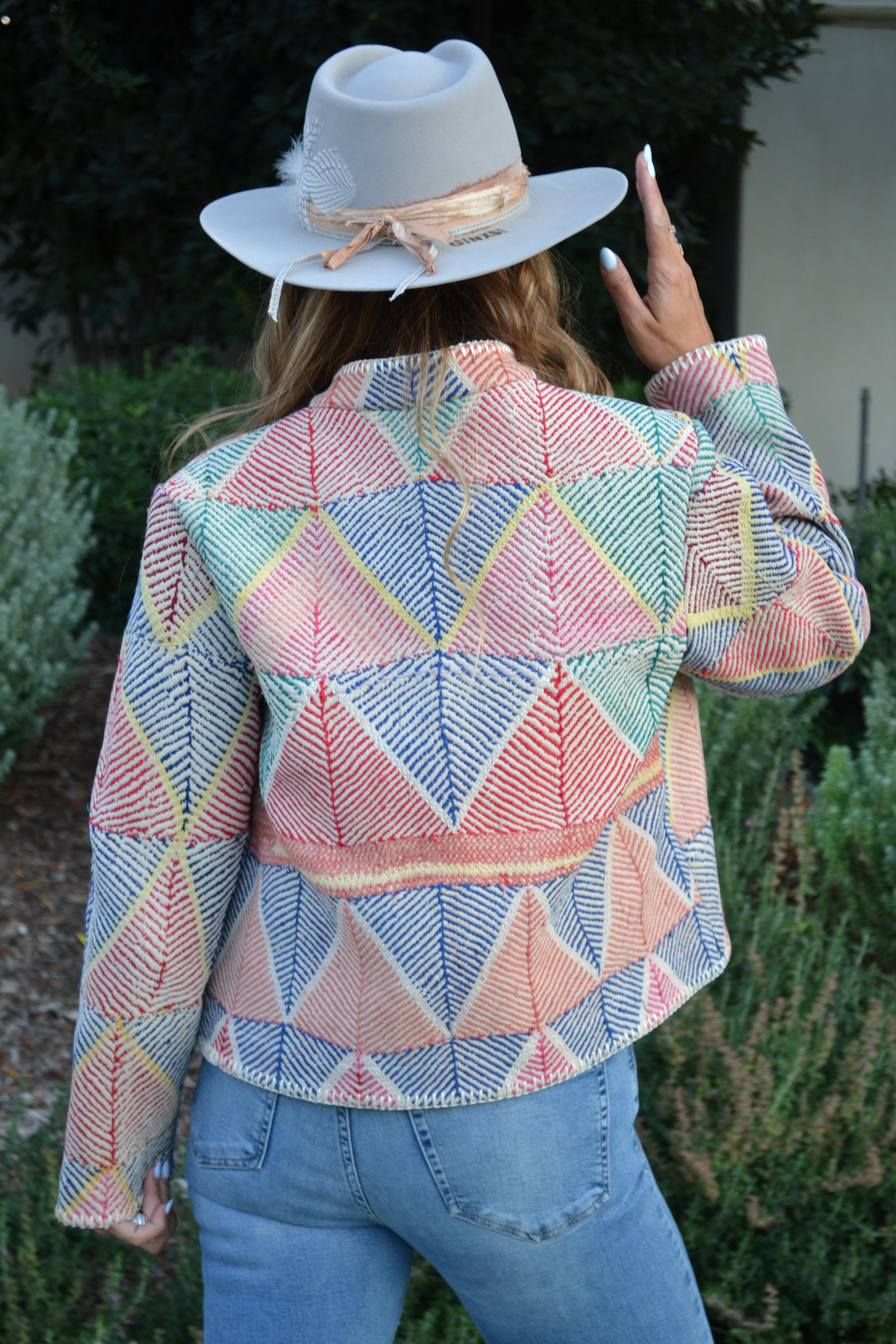 Embrace the beauty of tradition and contemporary style with our exquisite Kantha quilt jacket. Handcrafted by skilled artisans, this unique piece is a fusion of heritage and modern fashion. Each jacket is meticulously crafted using repurposed Vintage Kantha quilts, ensuring a one-of-a-kind garment that tells a story. Jackets are designed for a structured fit. Runs true to size.
