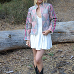 Embrace the beauty of tradition and contemporary style with our exquisite Kantha quilt jacket. Handcrafted by skilled artisans, this unique piece is a fusion of heritage and modern fashion. Each jacket is meticulously crafted using repurposed Vintage Kantha quilts, ensuring a one-of-a-kind garment that tells a story. Jackets are designed for a structured fit. Runs true to size.
