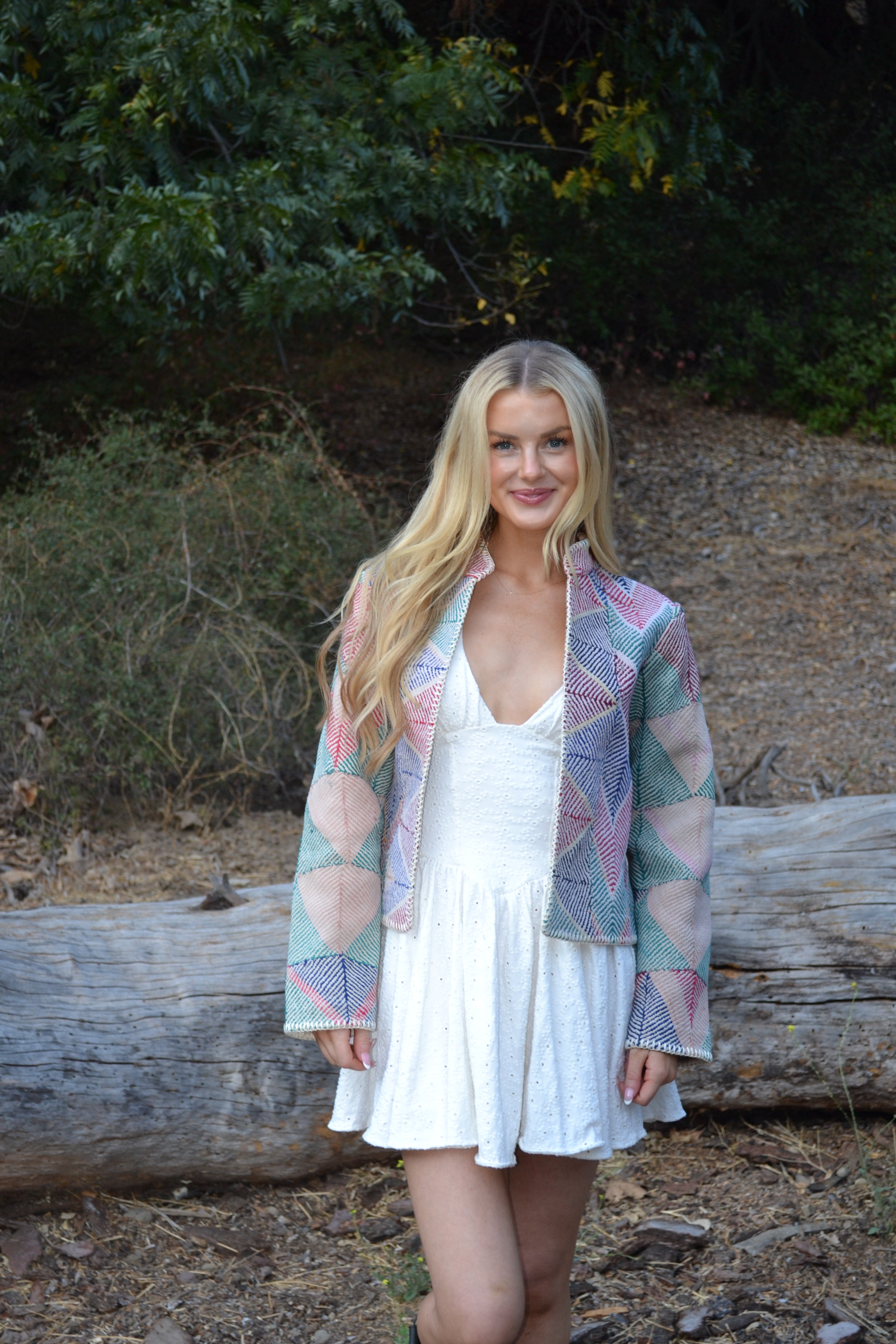 Embrace the beauty of tradition and contemporary style with our exquisite Kantha quilt jacket. Handcrafted by skilled artisans, this unique piece is a fusion of heritage and modern fashion. Each jacket is meticulously crafted using repurposed Vintage Kantha quilts, ensuring a one-of-a-kind garment that tells a story. Jackets are designed for a structured fit. Runs true to size.