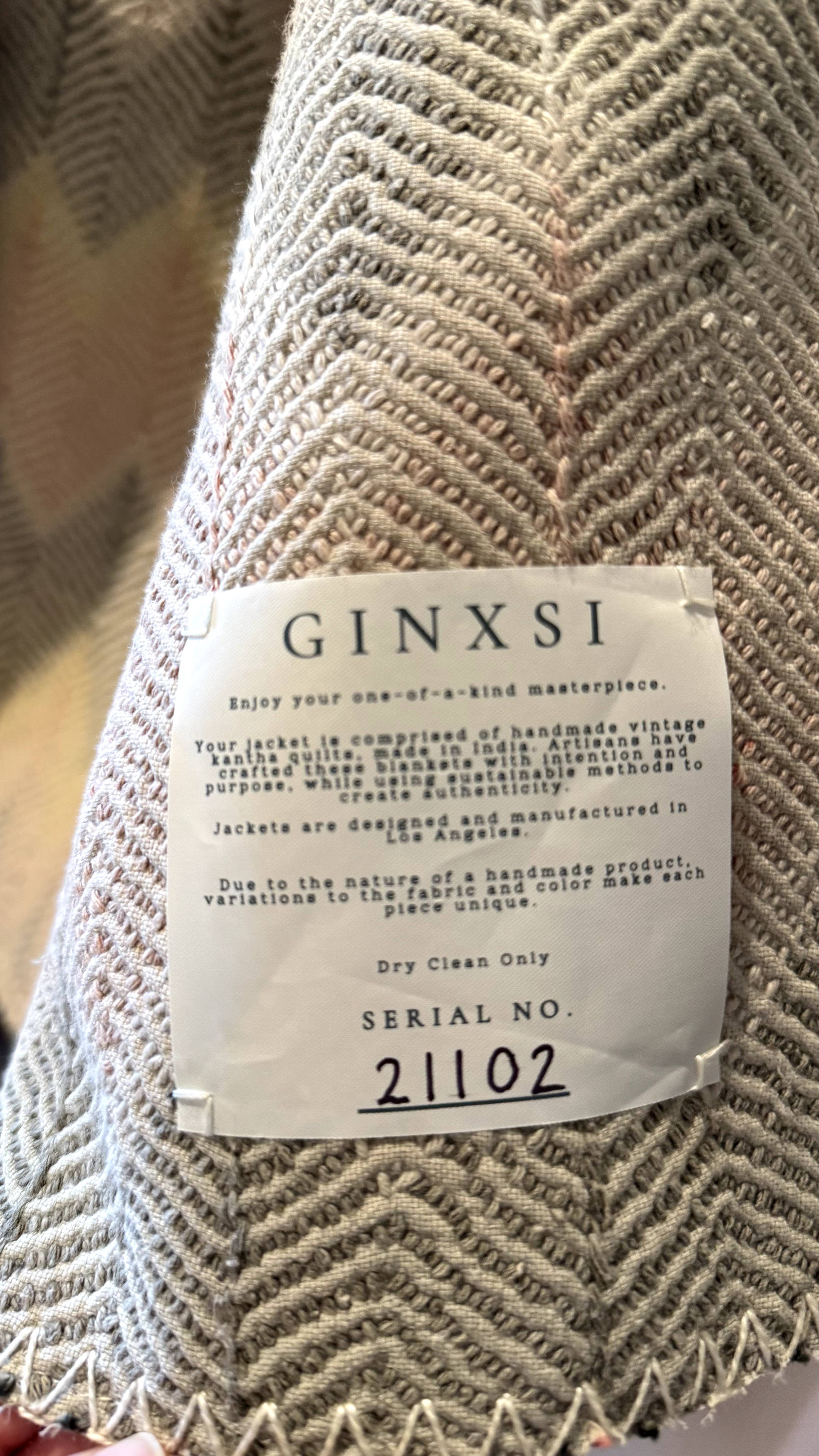 Ginxsi Jackets are made from repurposed Vintage Kantha quilts, and recycled cotton. The original patina may include areas of fraying or patches. Due to the nature of a handmade product, variations in the fabric and color make each piece unique.