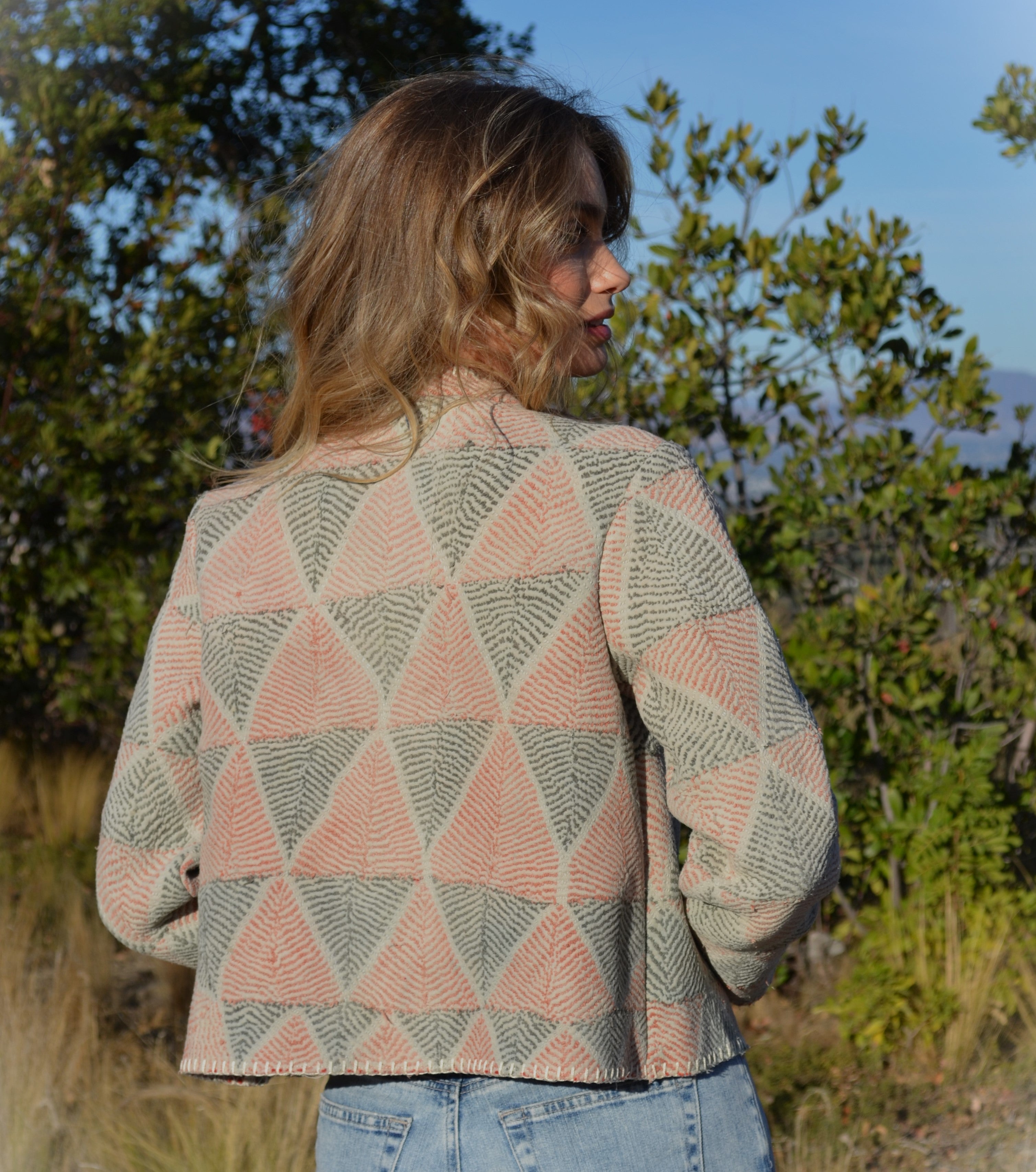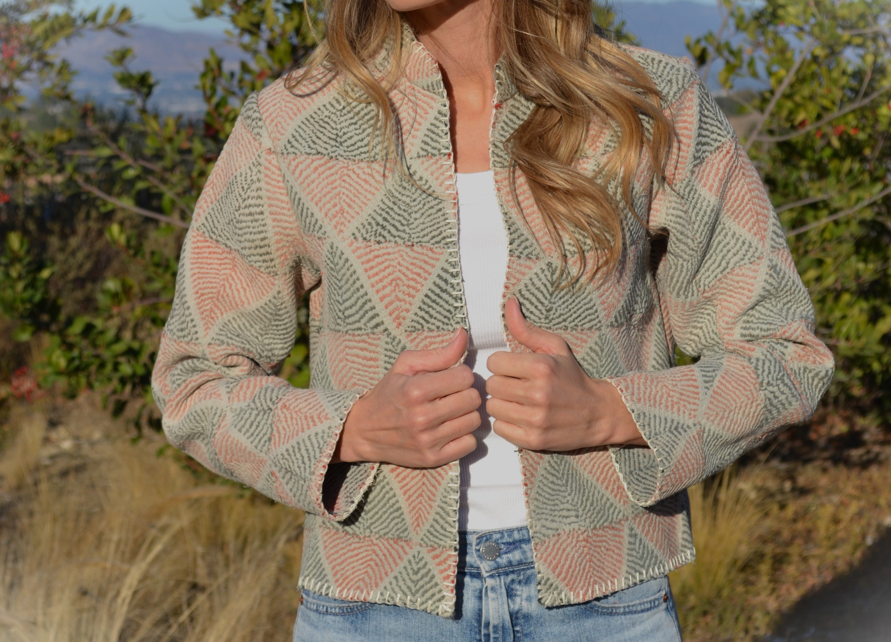 Embrace the beauty of tradition and contemporary style with our exquisite Kantha quilt jacket. Handcrafted by skilled artisans, this unique piece is a fusion of heritage and modern fashion. Each jacket is meticulously crafted using repurposed Vintage Kantha quilts, ensuring a one-of-a-kind garment that tells a story. Jackets are designed for a structured fit. Runs true to size.