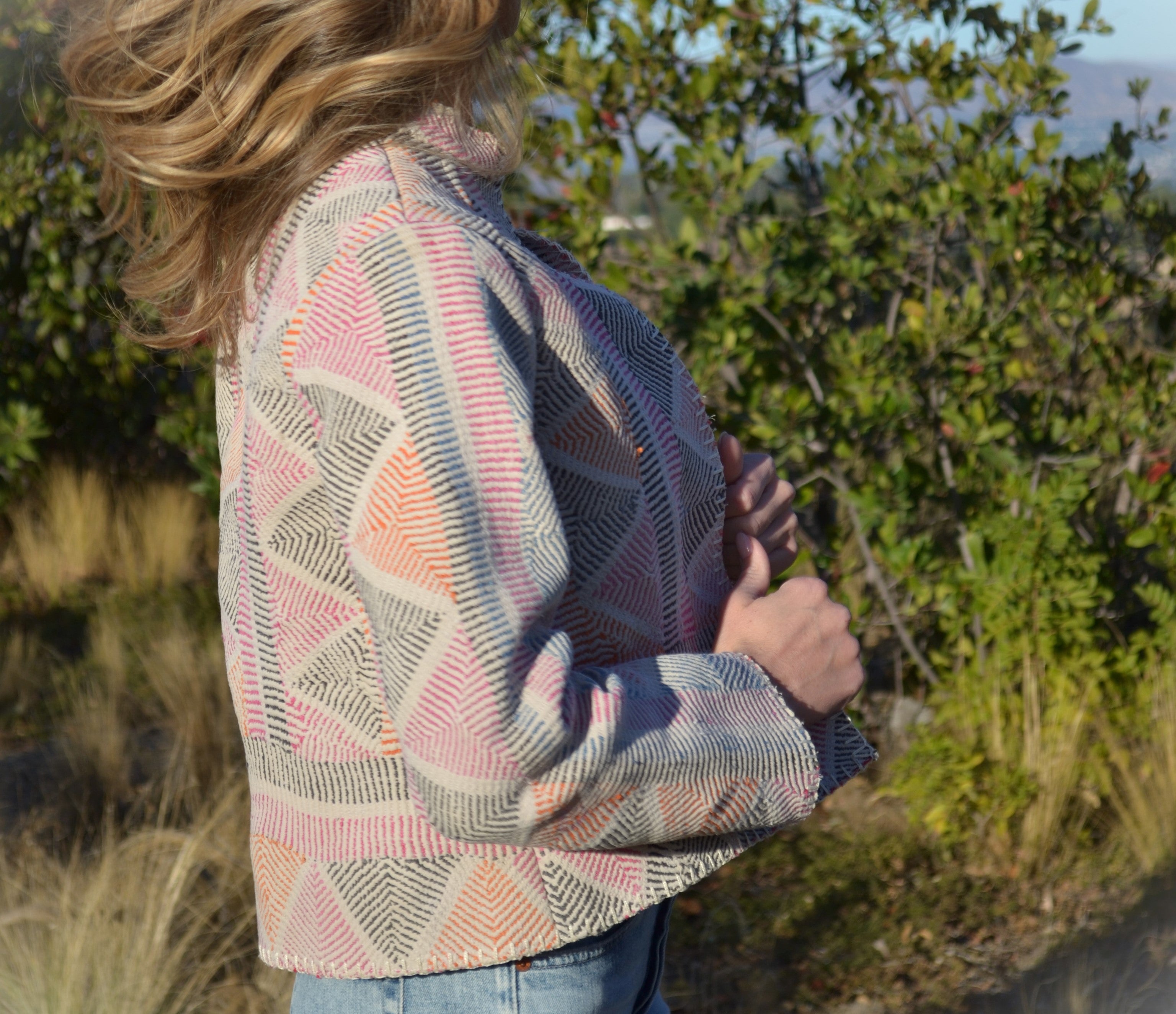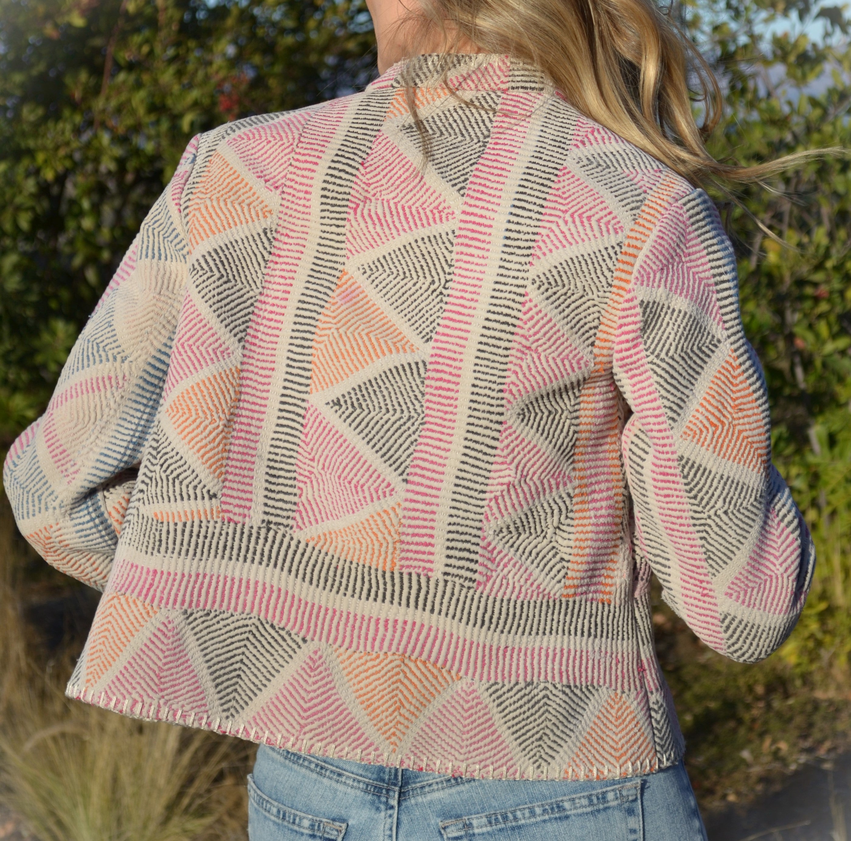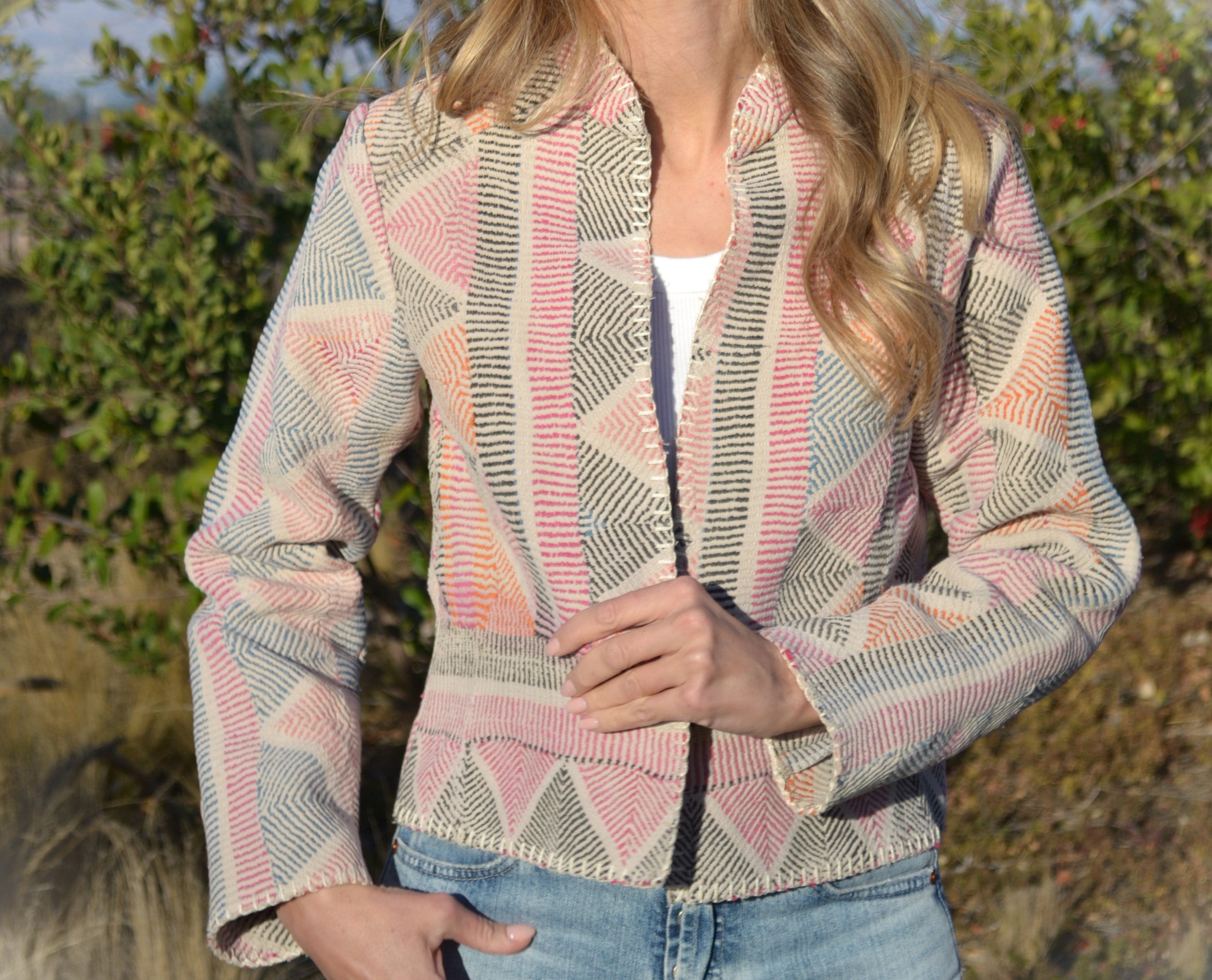 Ginxsi Jackets are made from repurposed Vintage Kantha quilts, and recycled cotton. The original patina may include areas of fraying or patches. Due to the nature of a handmade product, variations in the fabric and color make each piece unique.