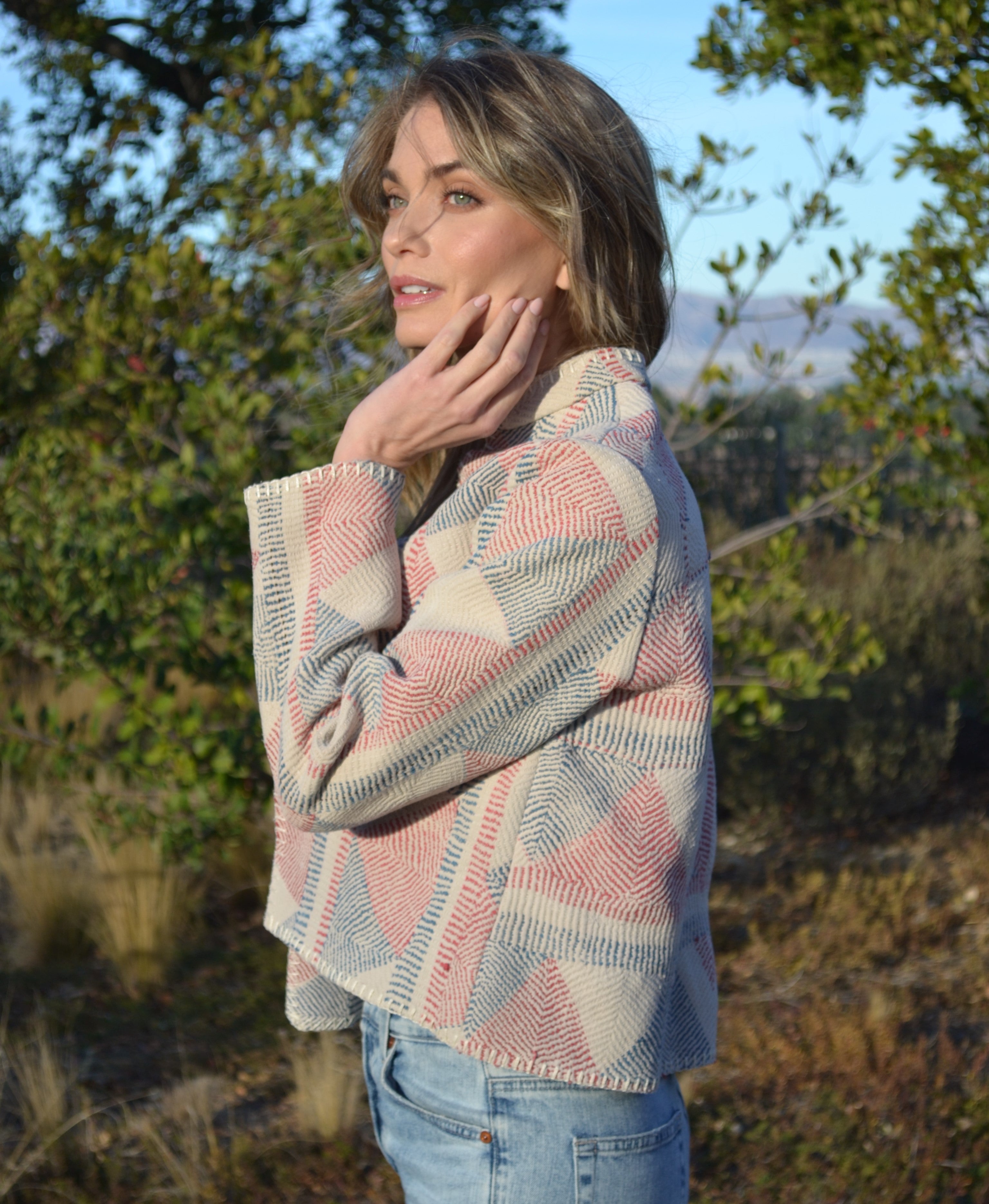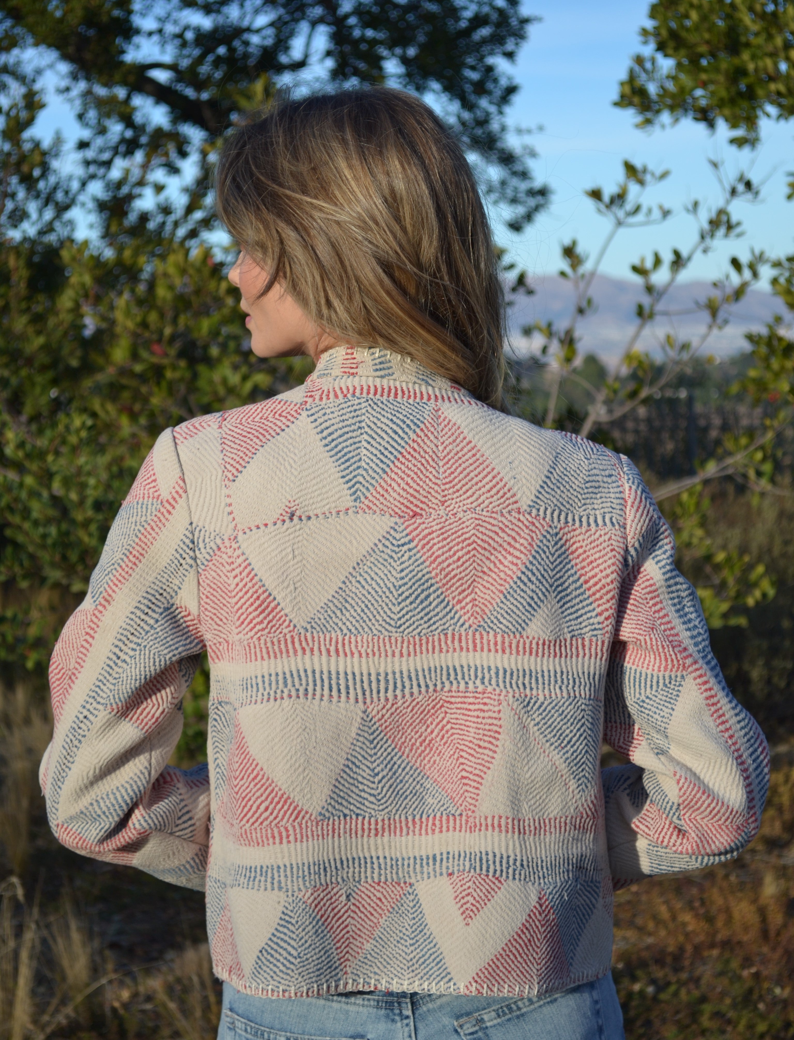 Ginxsi Jackets are made from repurposed Vintage Kantha quilts, and recycled cotton. The original patina may include areas of fraying or patches. Due to the nature of a handmade product, variations in the fabric and color make each piece unique.