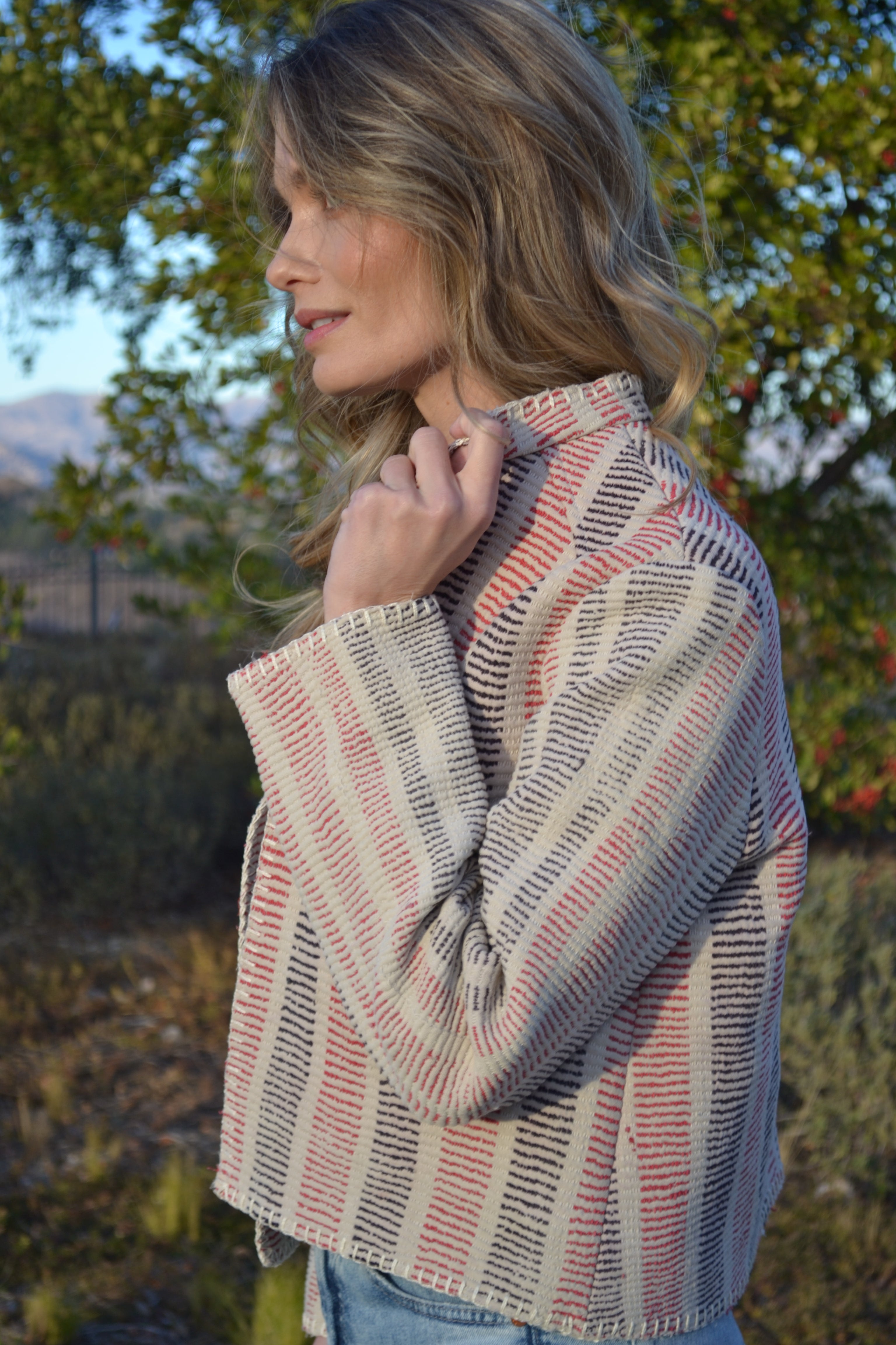Ginxsi Jackets are made from repurposed Vintage Kantha quilts, and recycled cotton. The original patina may include areas of fraying or patches. Due to the nature of a handmade product, variations in the fabric and color make each piece unique.