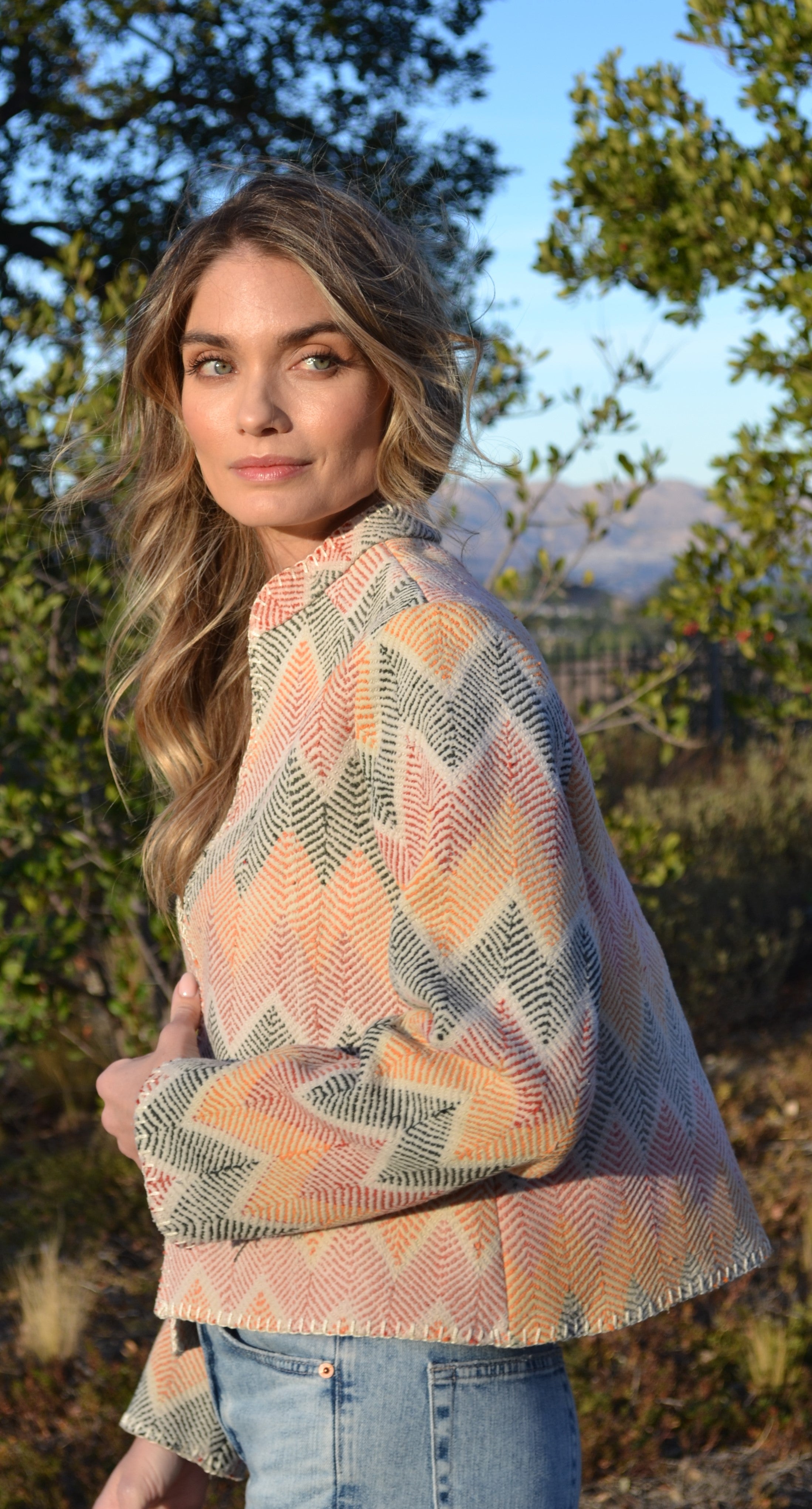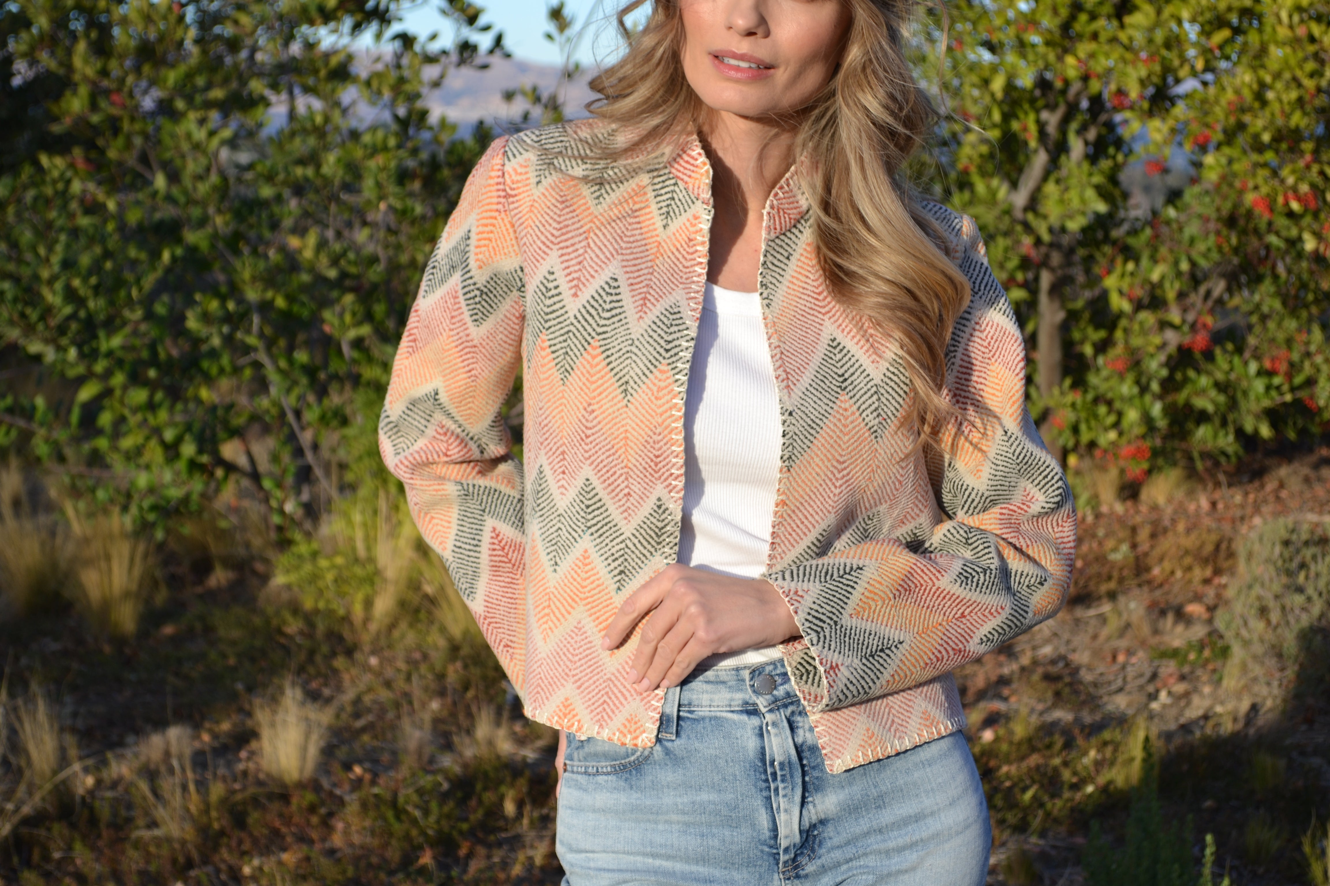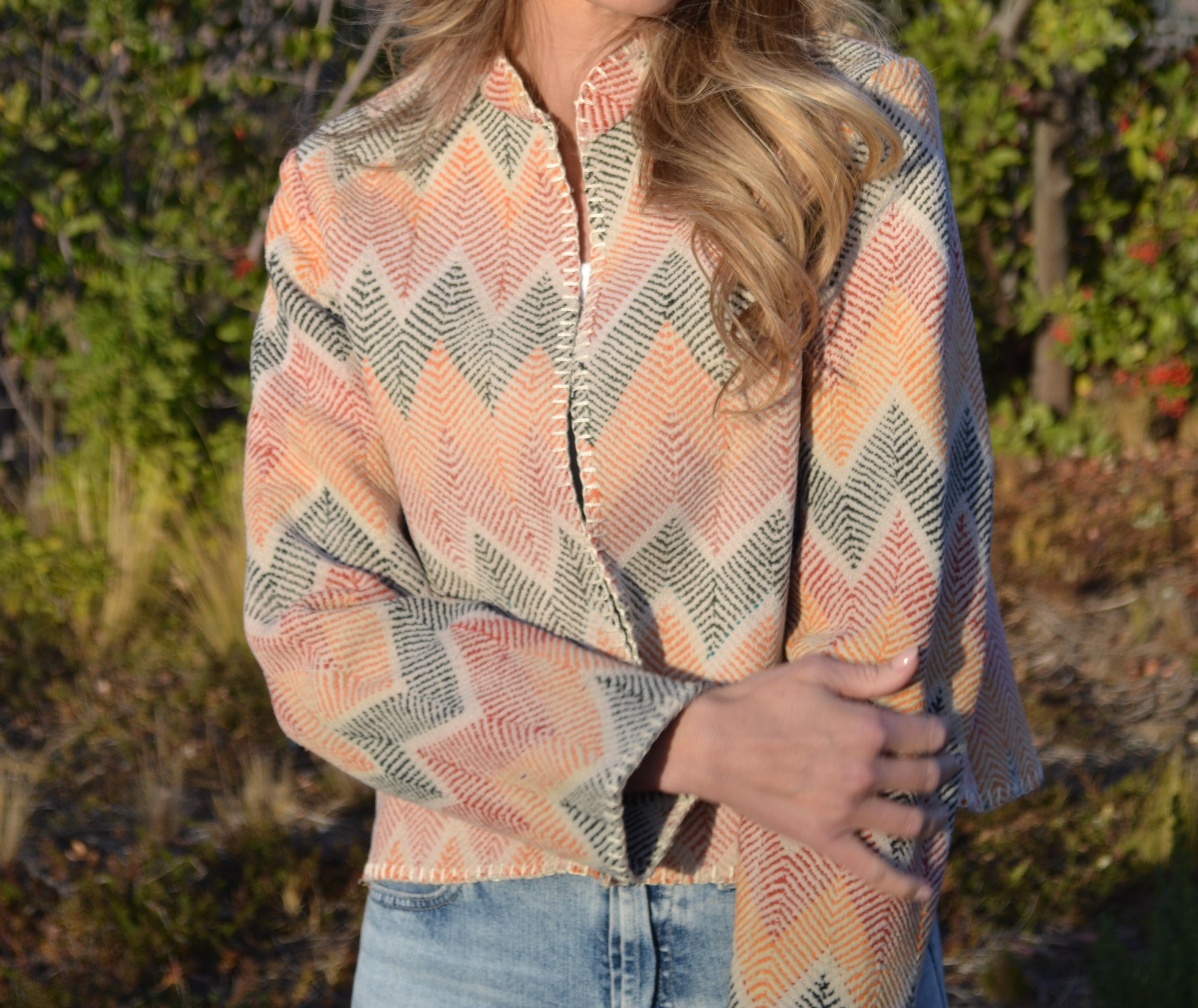 Ginxsi Jackets are made from repurposed Vintage Kantha quilts, and recycled cotton. The original patina may include areas of fraying or patches. Due to the nature of a handmade product, variations in the fabric and color make each piece unique.