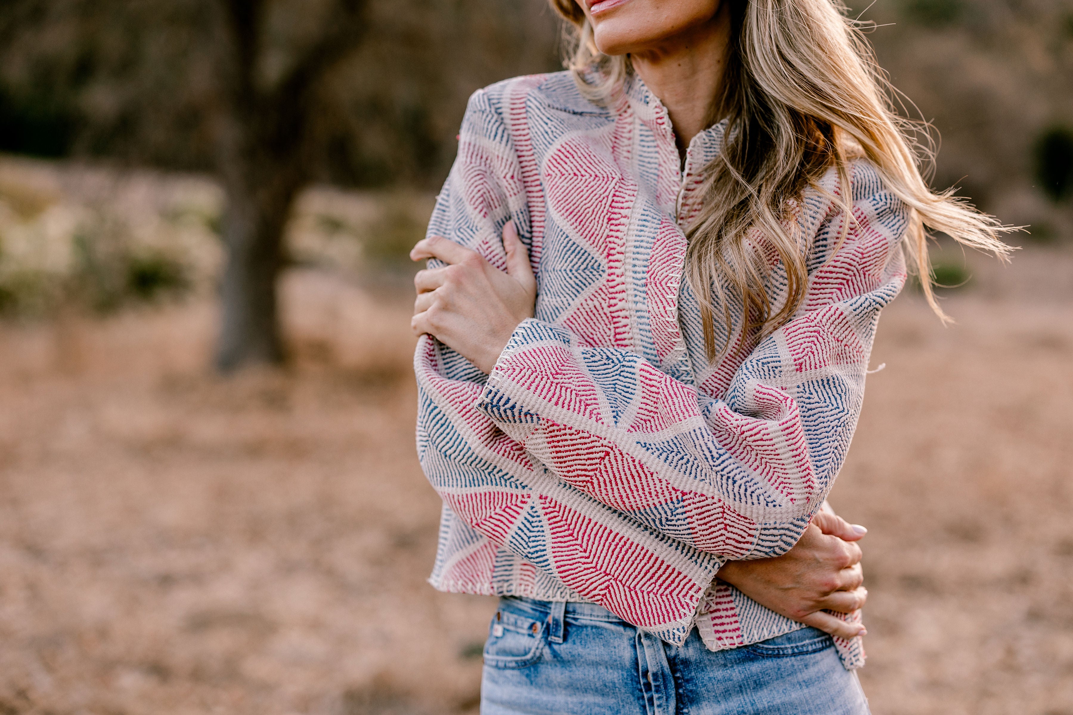 Ginxsi Jackets are made from repurposed Vintage Kantha quilts, and recycled cotton. The original patina may include areas of fraying or patches. Due to the nature of a handmade product, variations in the fabric and color make each piece unique.